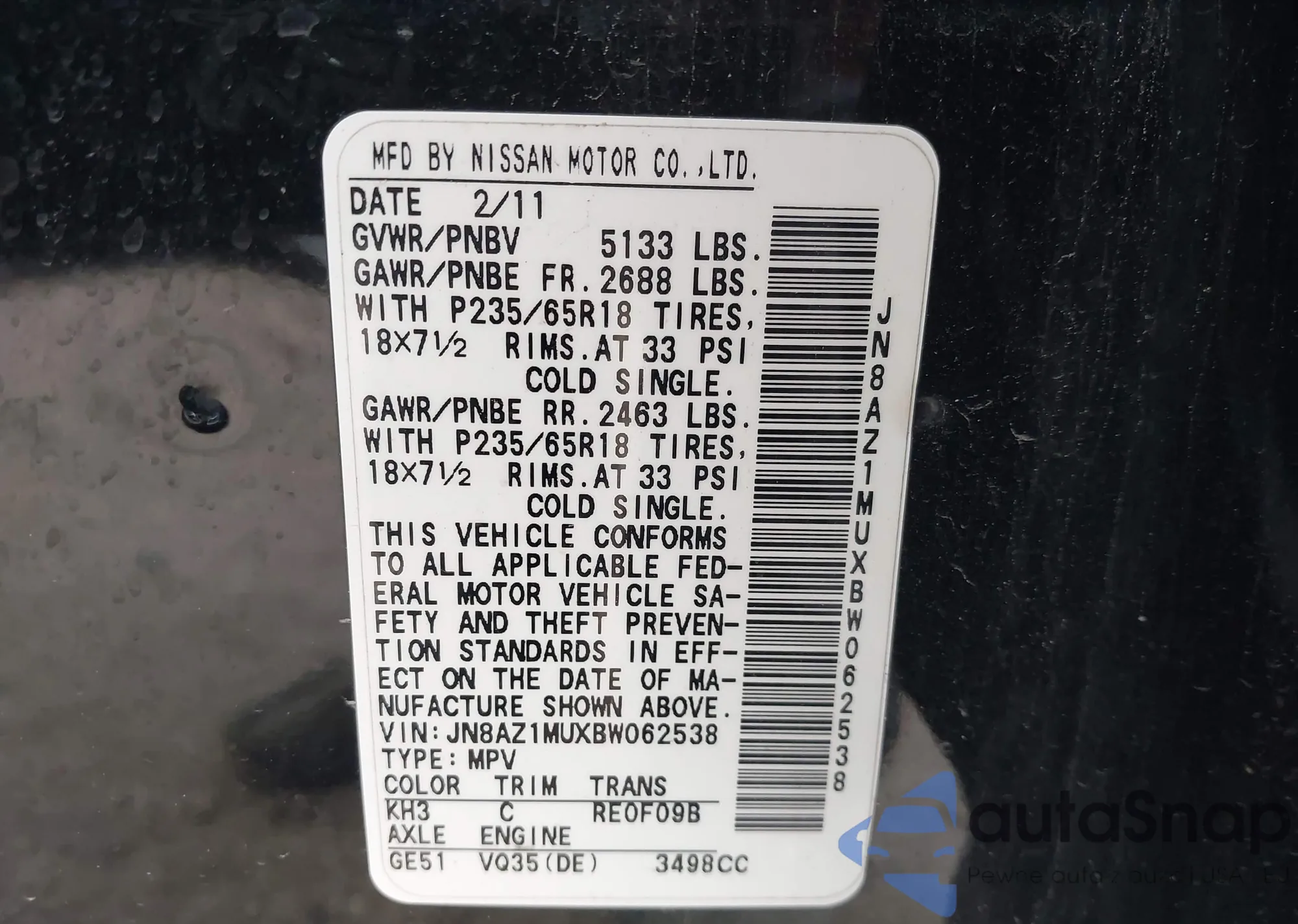 • VIN JN8AZ1MUXBW062538