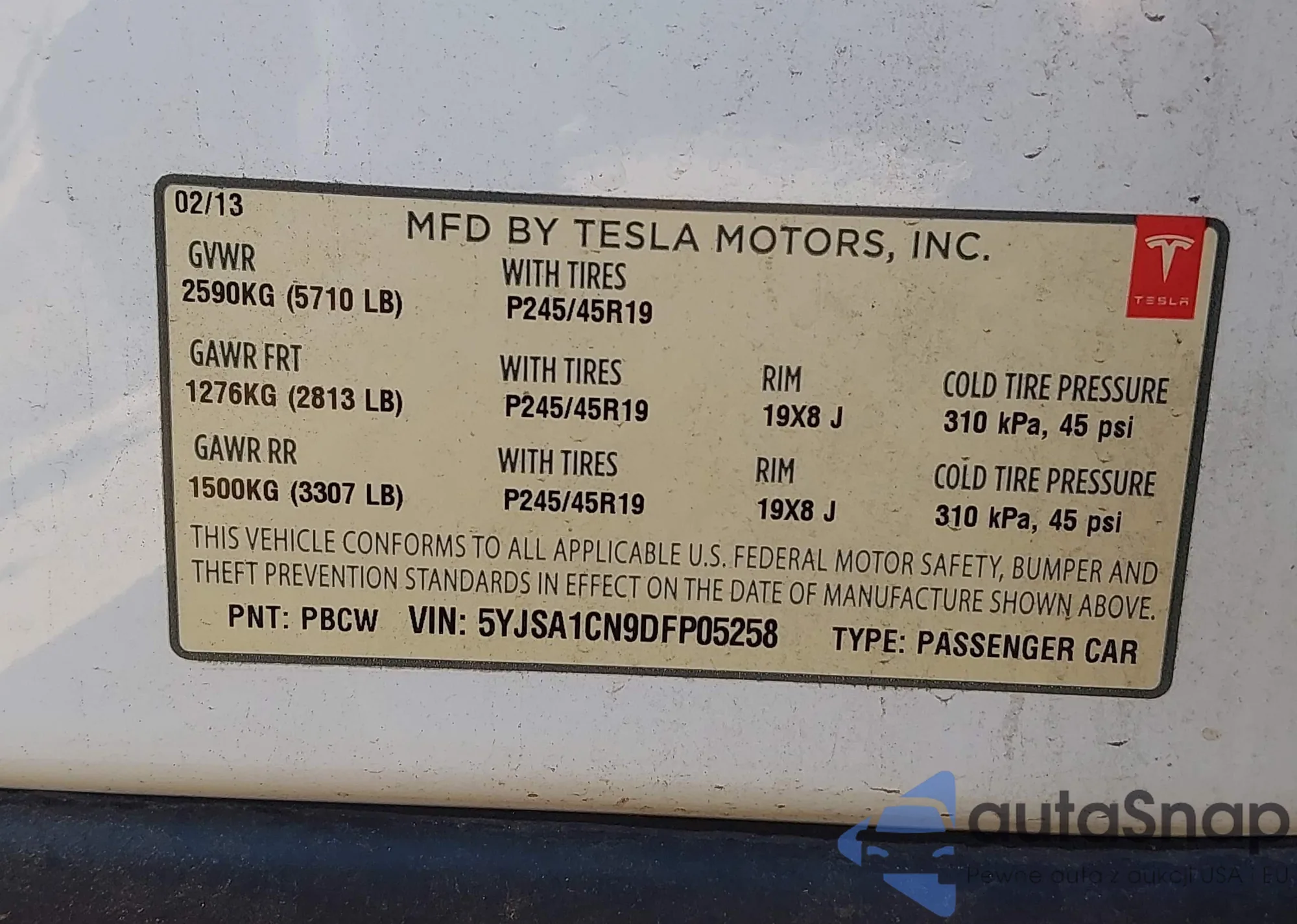• VIN 5YJSA1CN9DFP05258