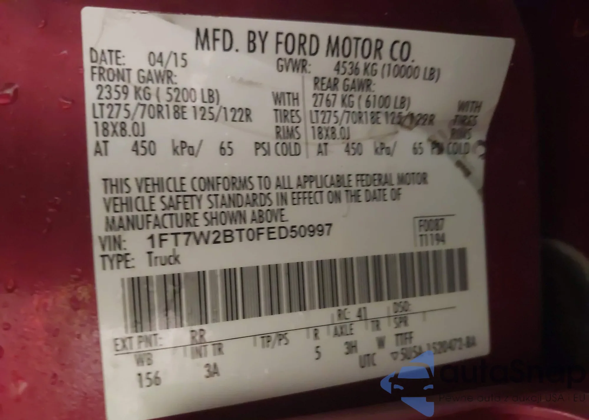 LOT: 43436939 VIN: 1FT7W2BT0FED50997