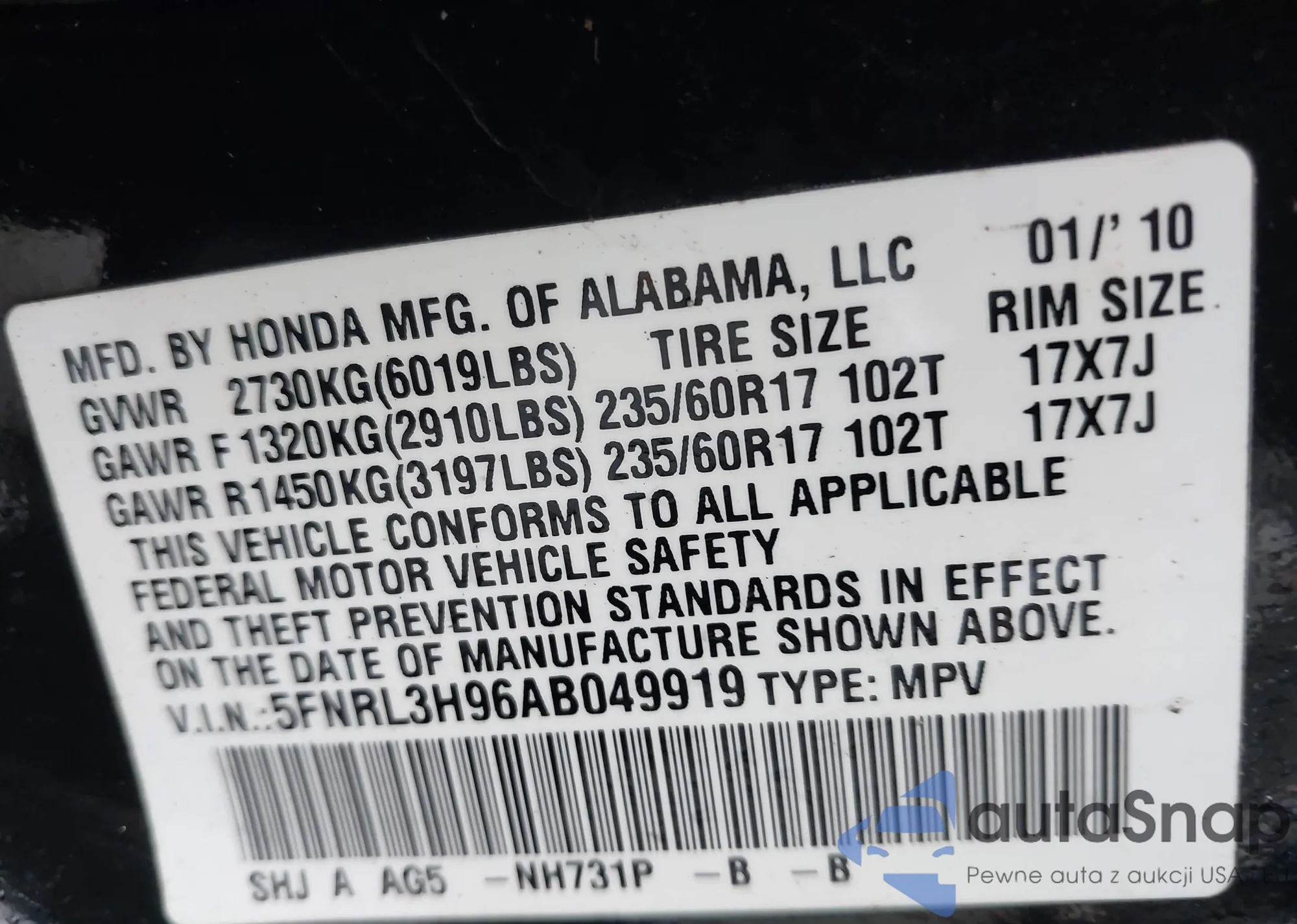 • VIN 5FNRL3H96AB049919