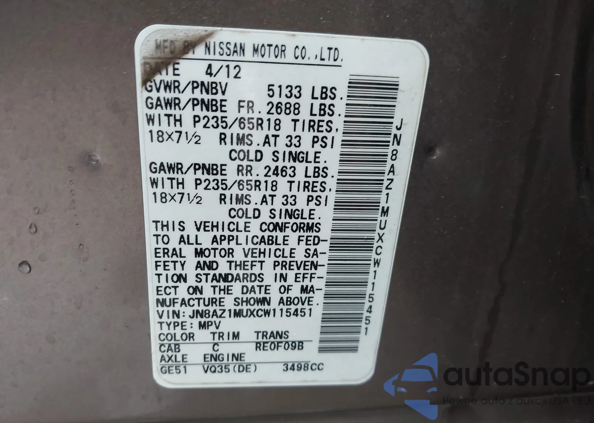 • VIN JN8AZ1MUXCW115451