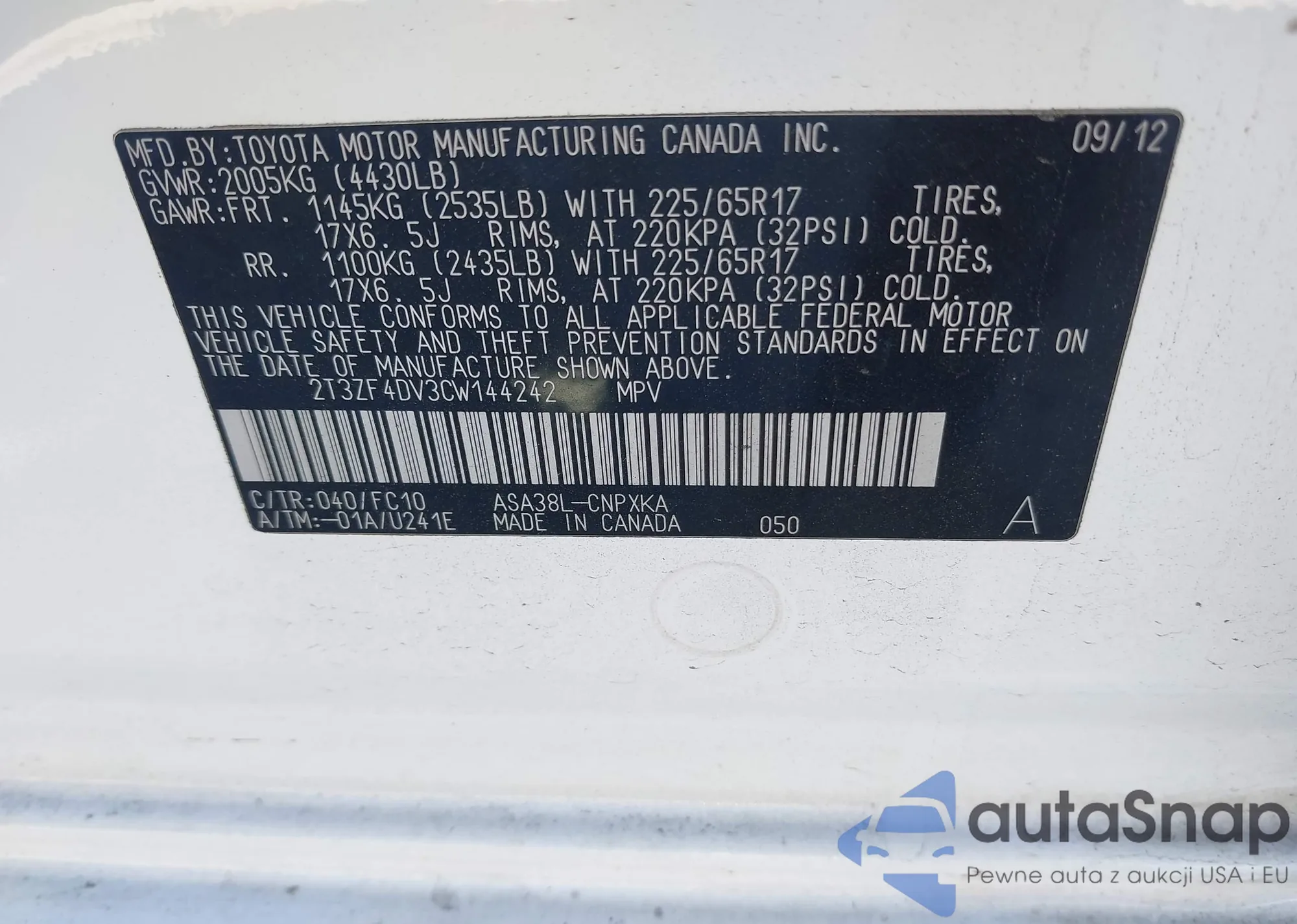 LOT: 43076055 VIN: 5NMSG3AB0AH379881