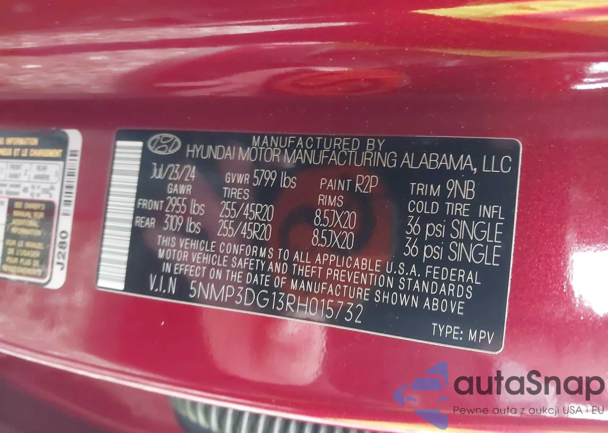 LOT: 43790290 VIN: 5NMP3DG13RH015732
