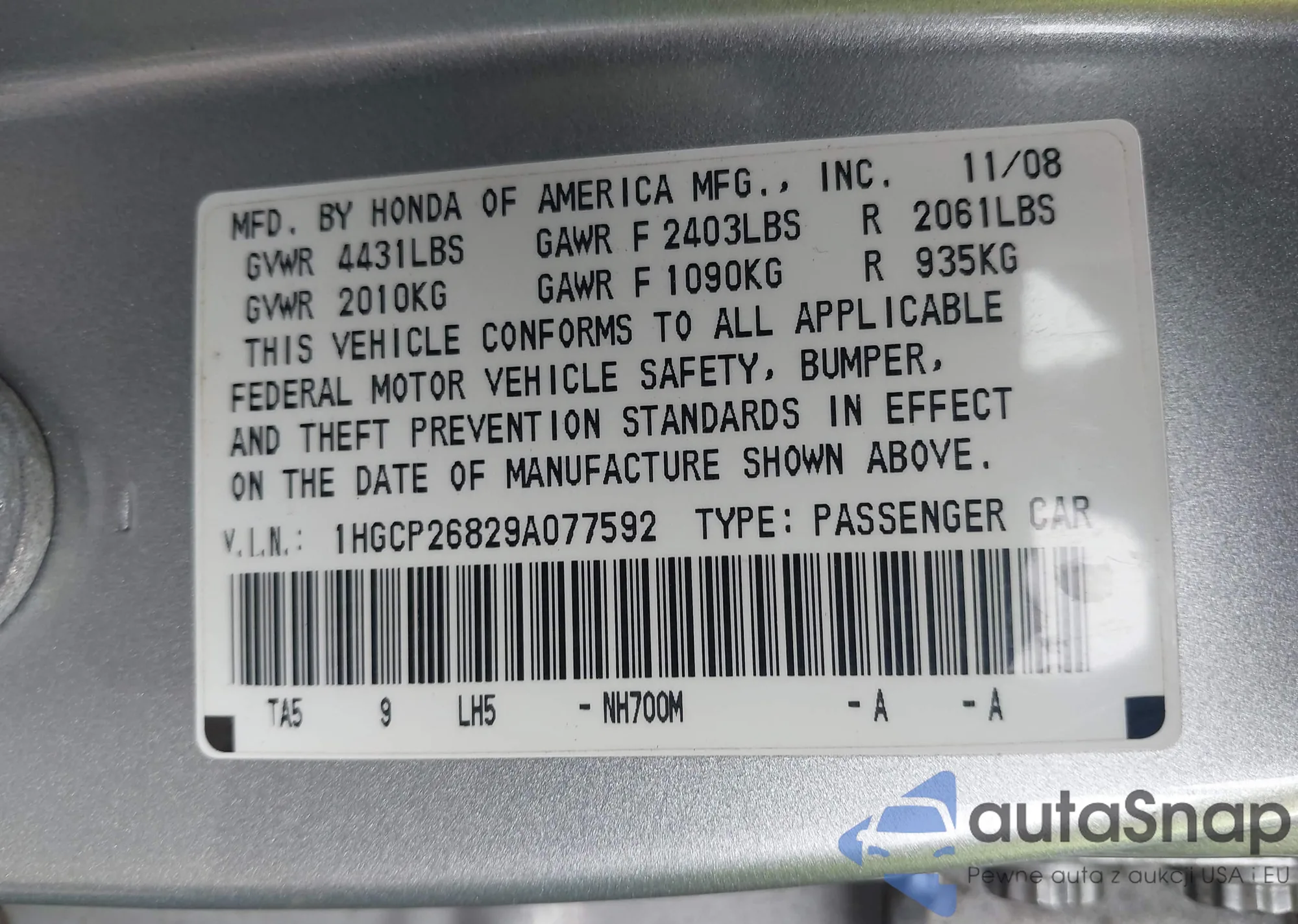LOT: 43765558 VIN: 1HGCP26829A077592