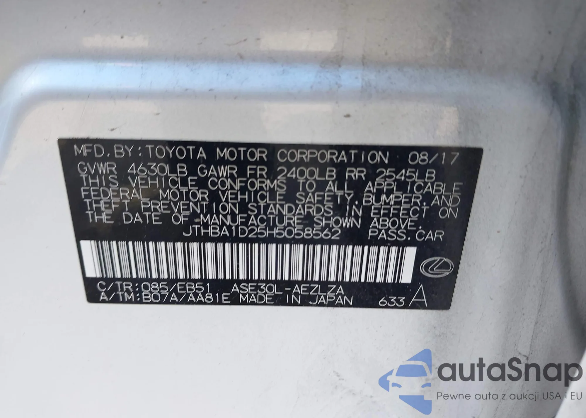 LOT: 43504746 VIN: JTHBA1D25H5058562