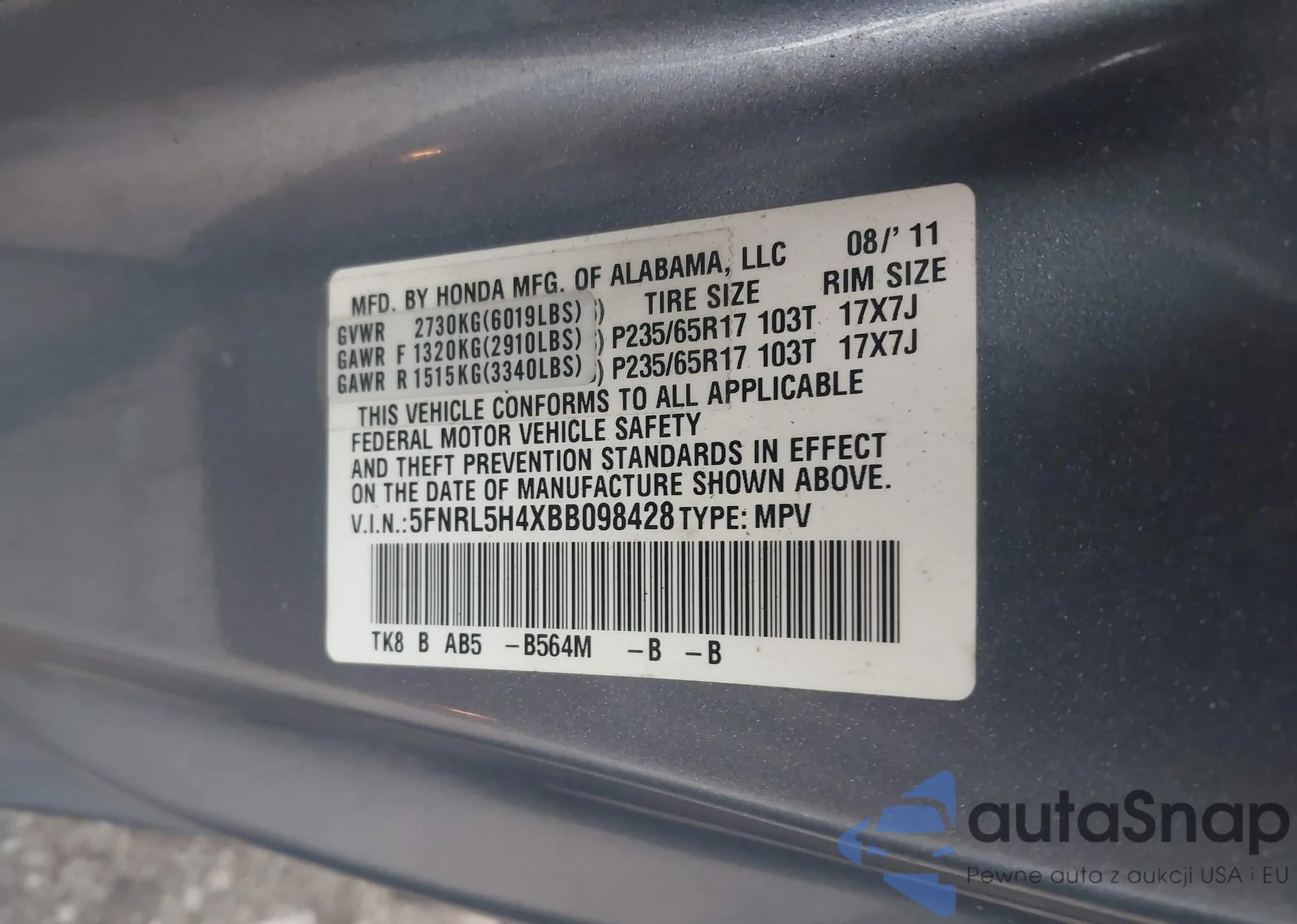• VIN 5FPYK3F74MB019734