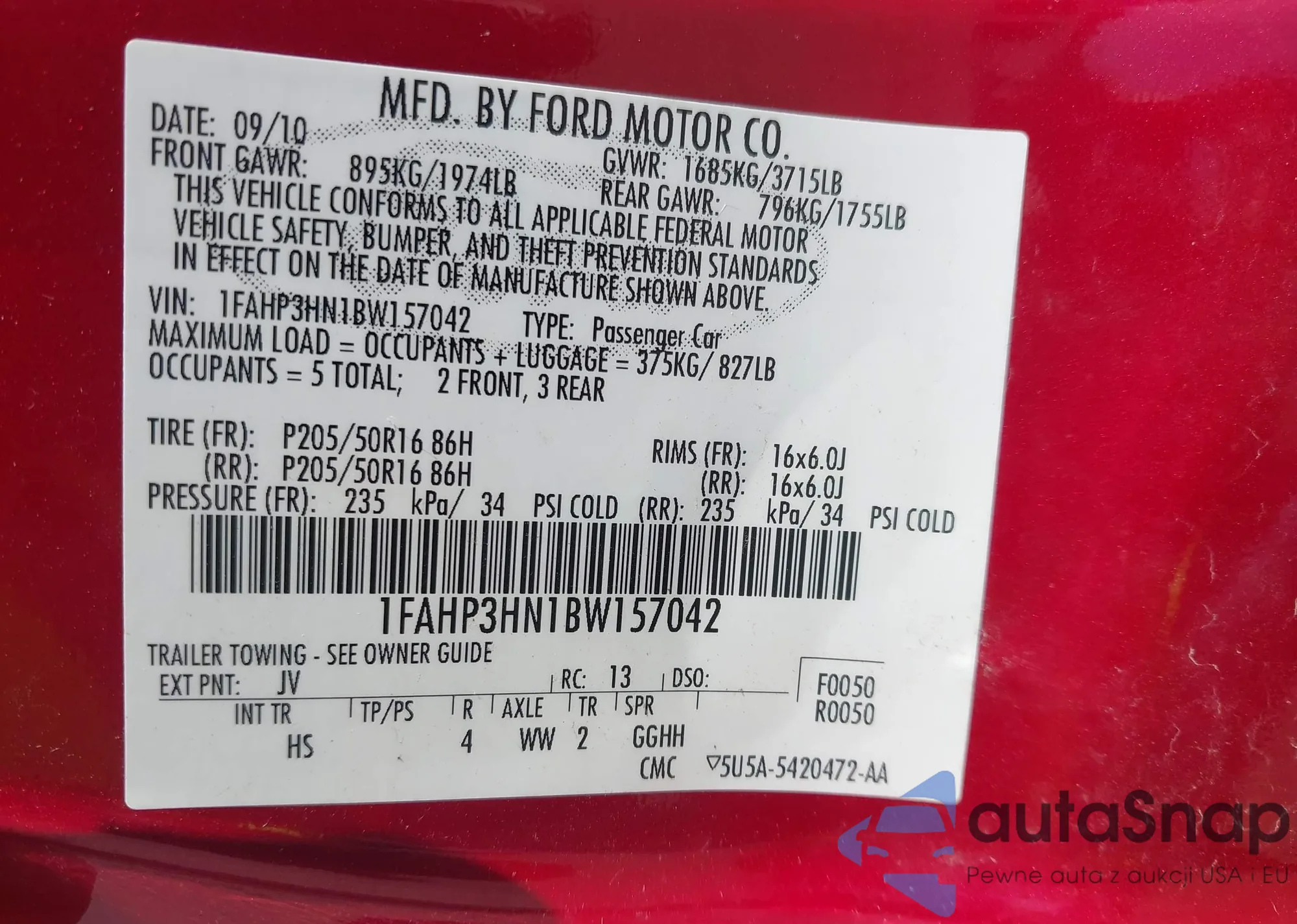 • VIN 1FAHP3HN1BW157042