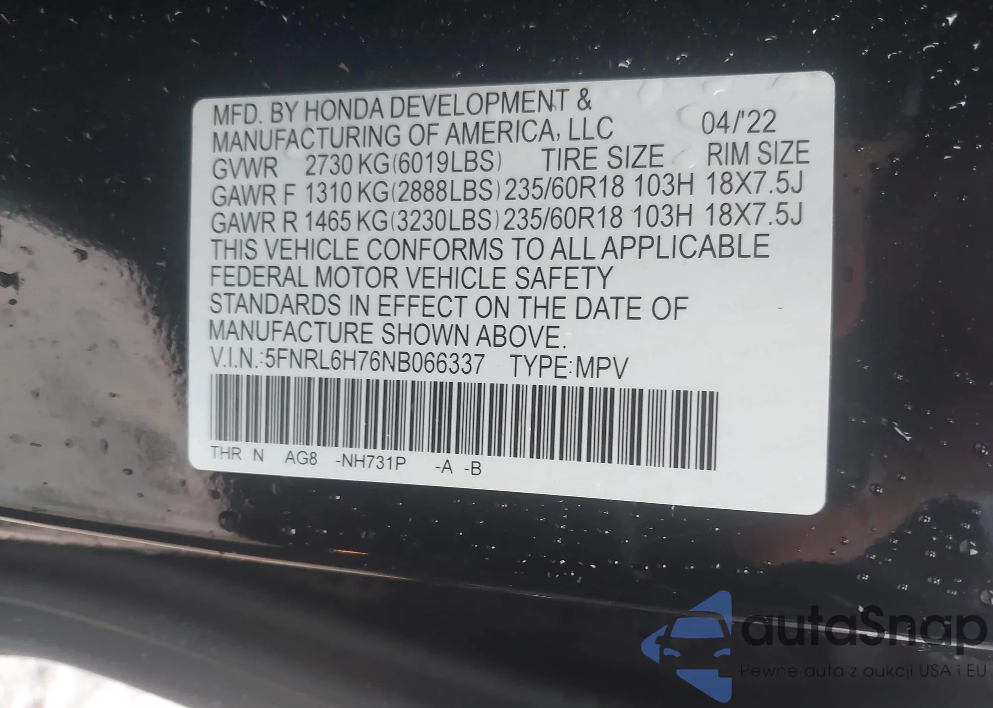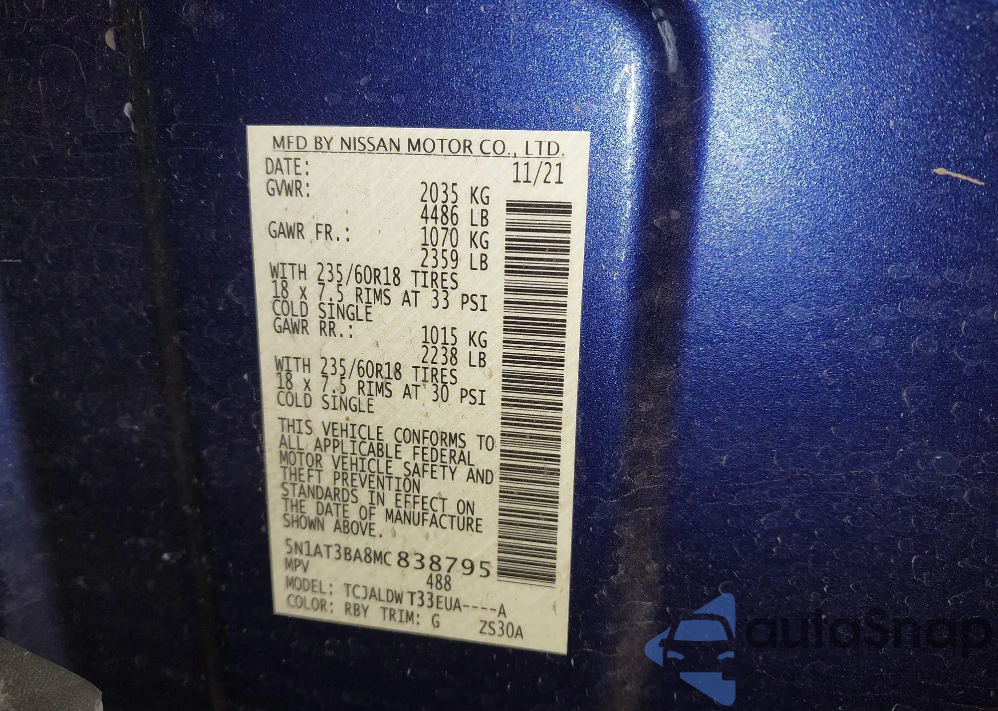 • VIN 5N1AT3BA8MC838795