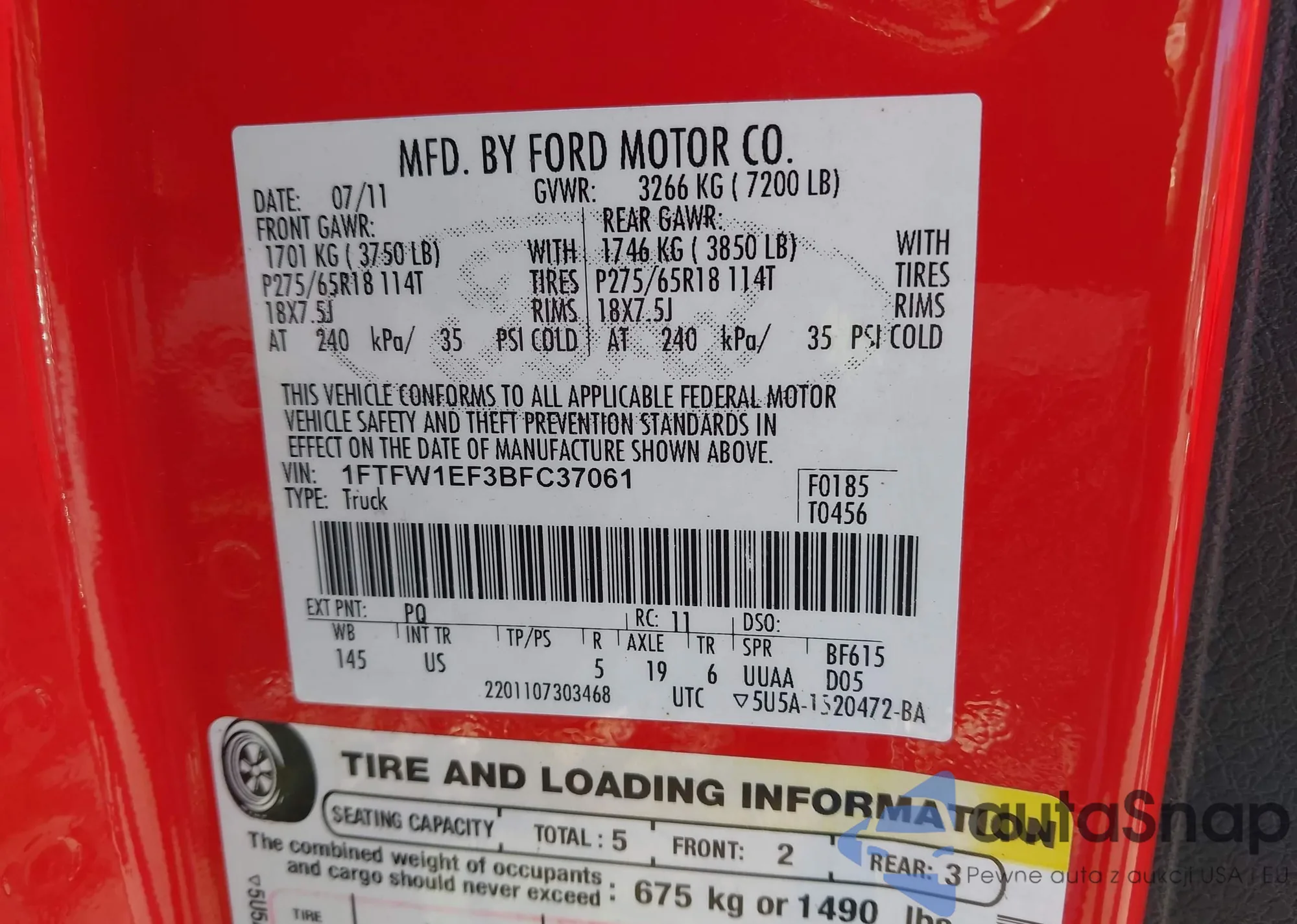 • VIN 1FTFW1EF3BFC37061
