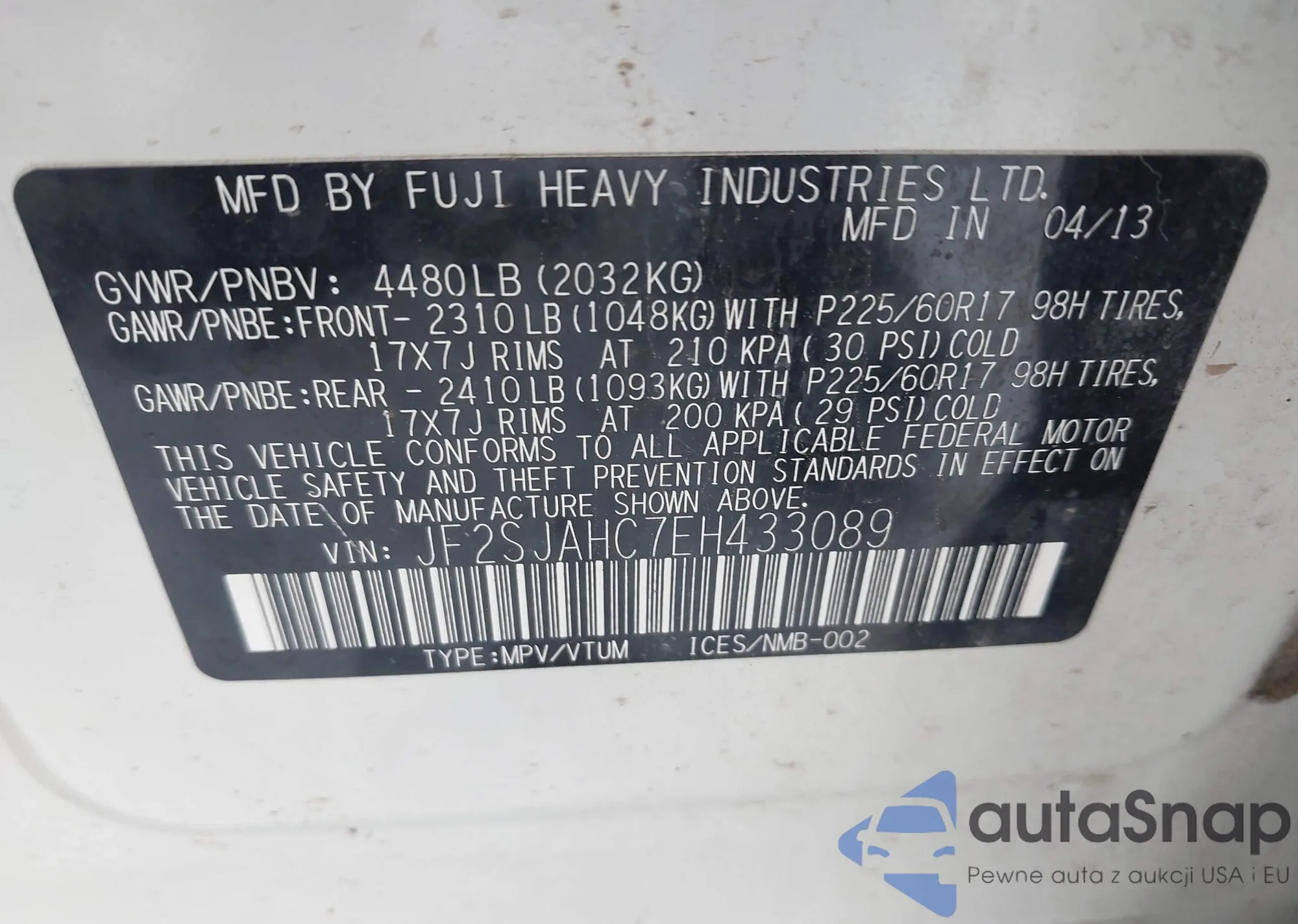 • VIN JF2SJAHC7EH433089