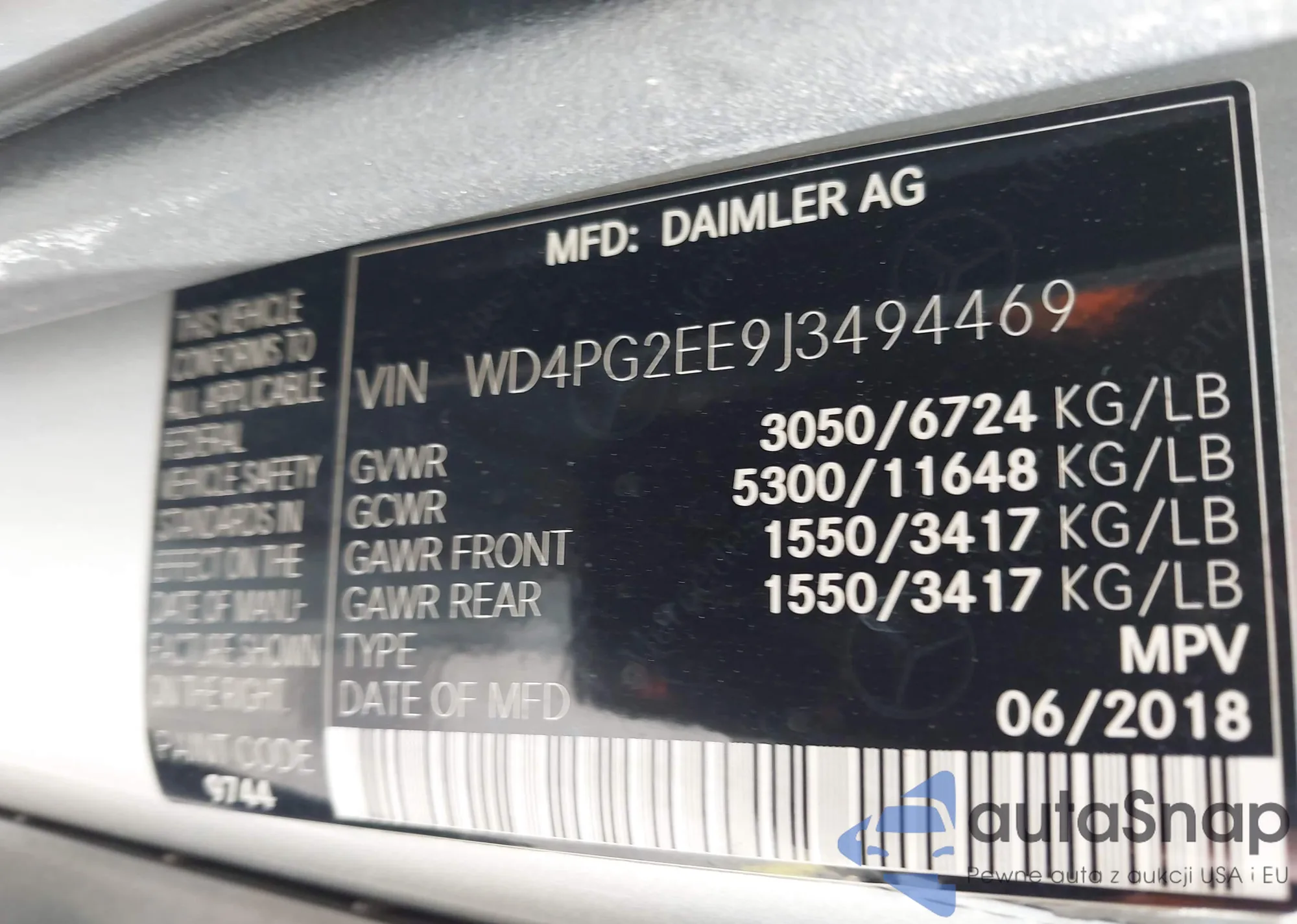 LOT: 43574784 VIN: WD4PG2EE9J3494469