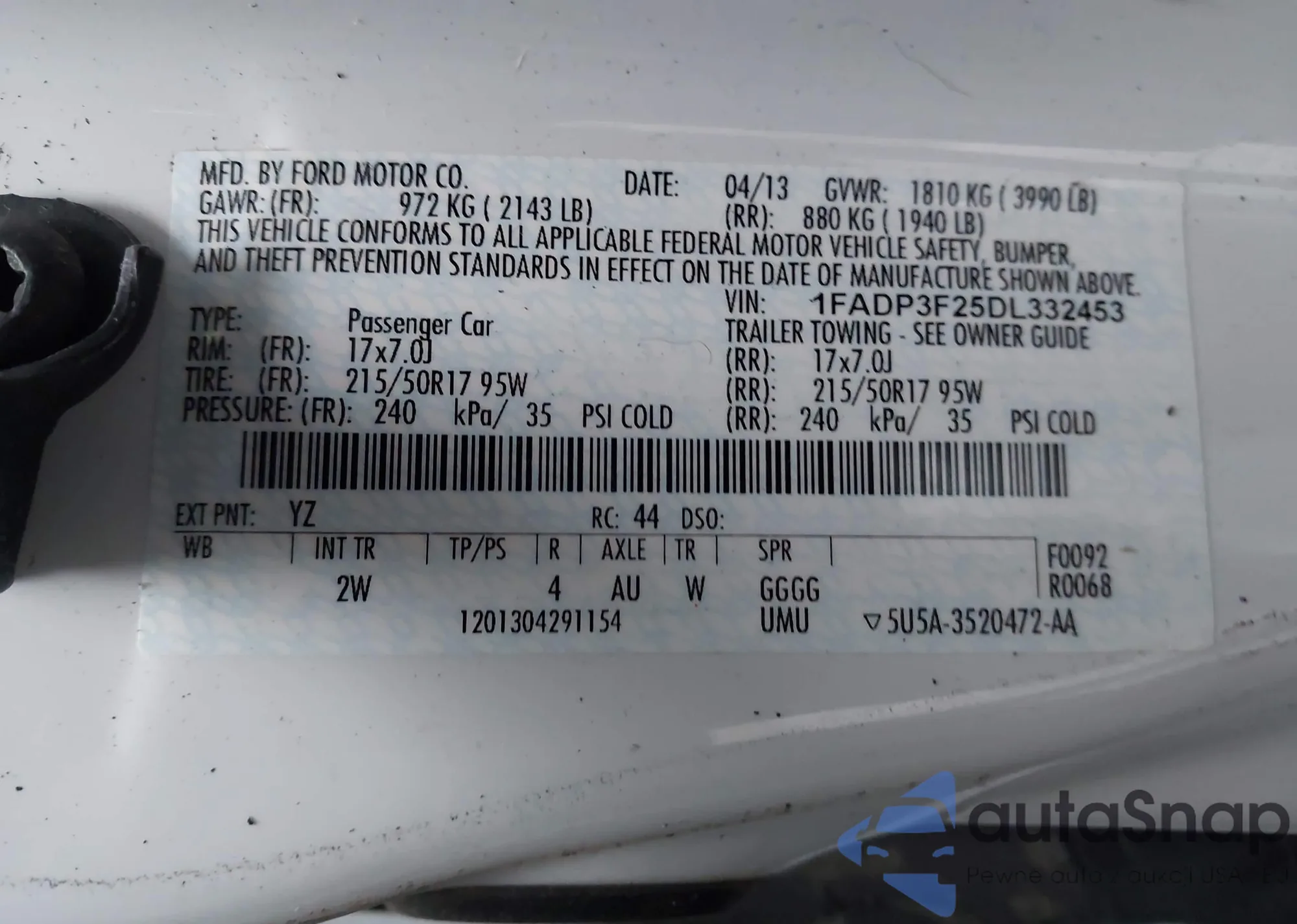 LOT: 43780136 VIN: 1FADP3F25DL332453