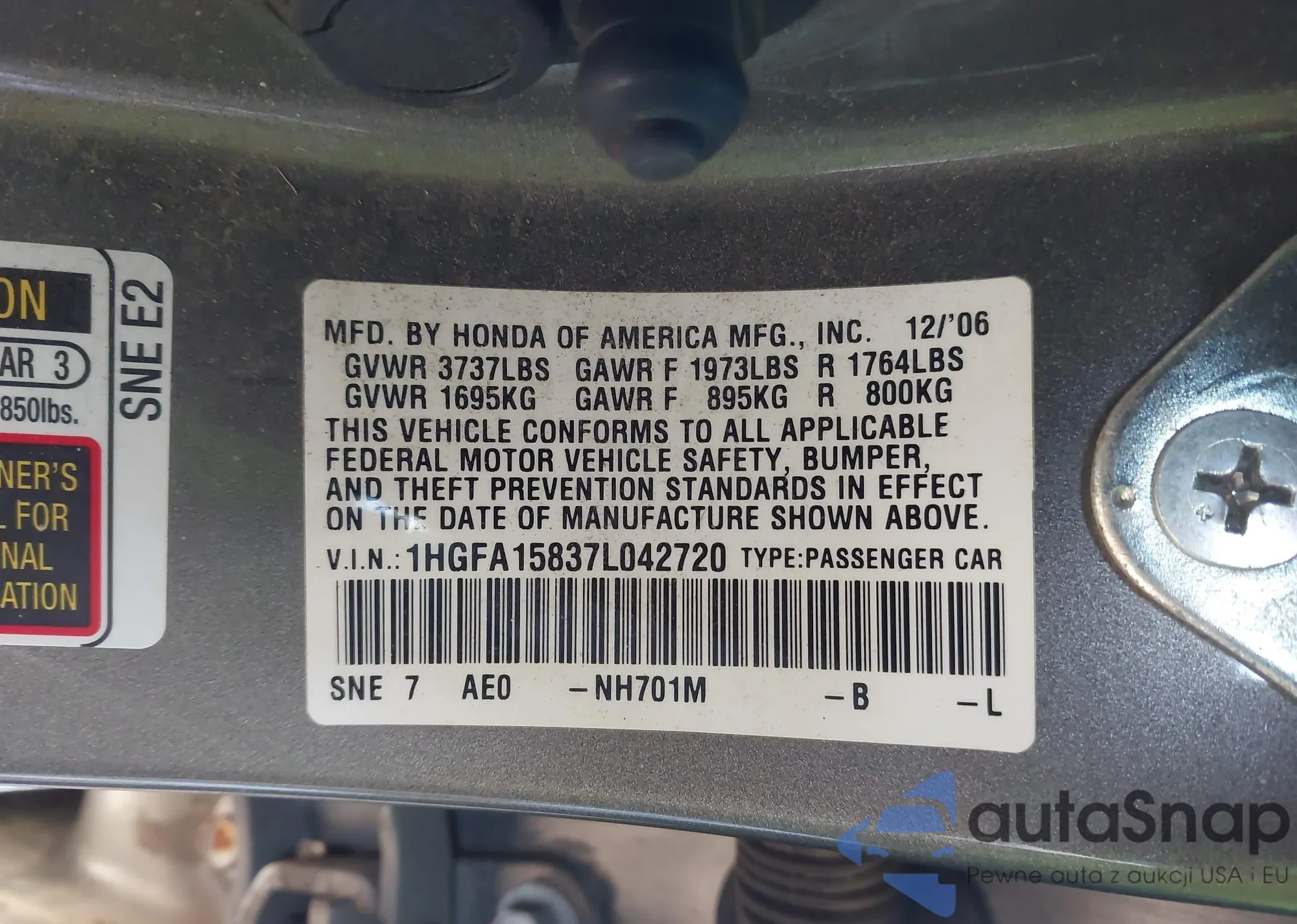LOT: 43862882 VIN: 1HGFA15837L042720