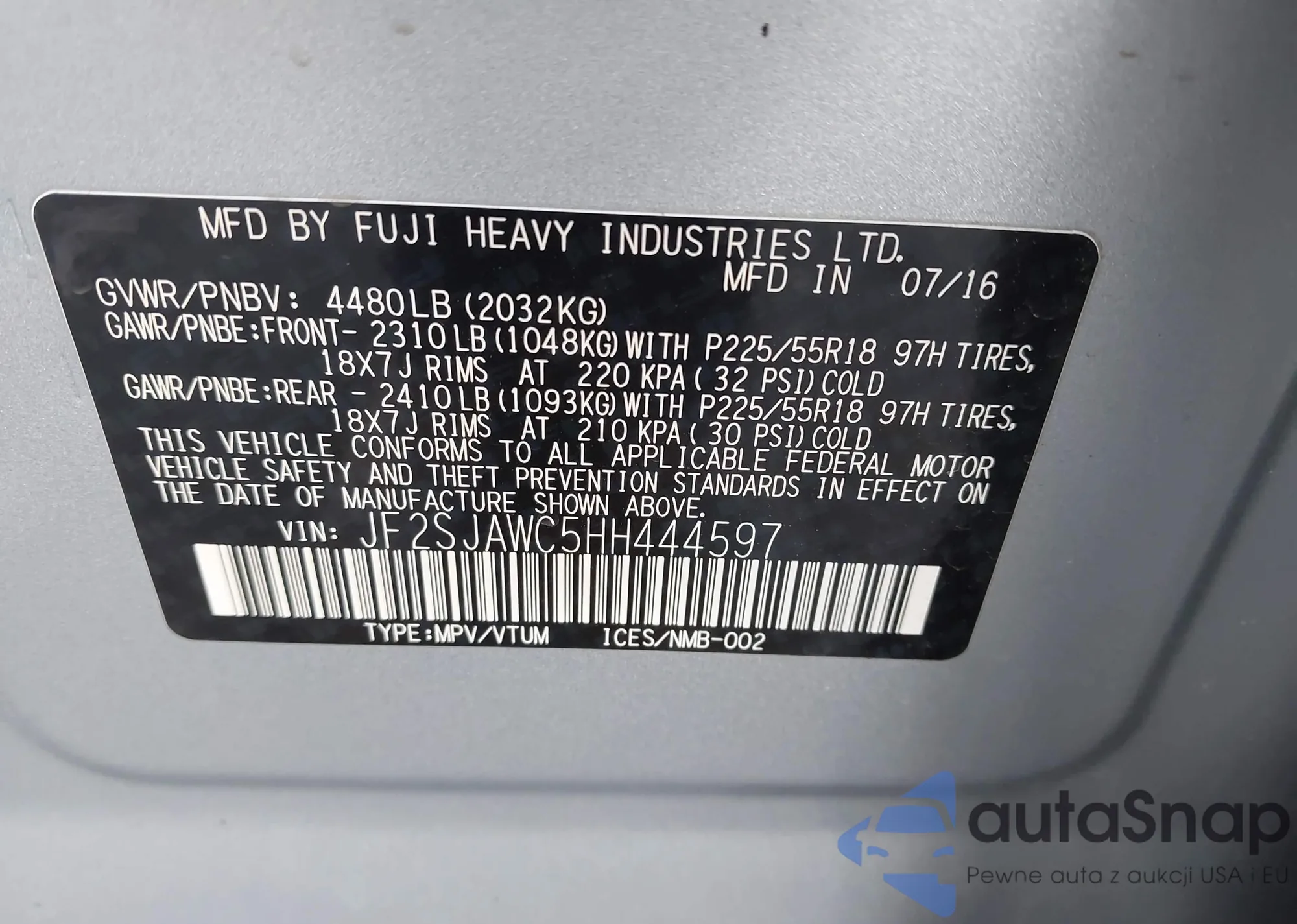 • VIN JF2SJAWC5HH444597
