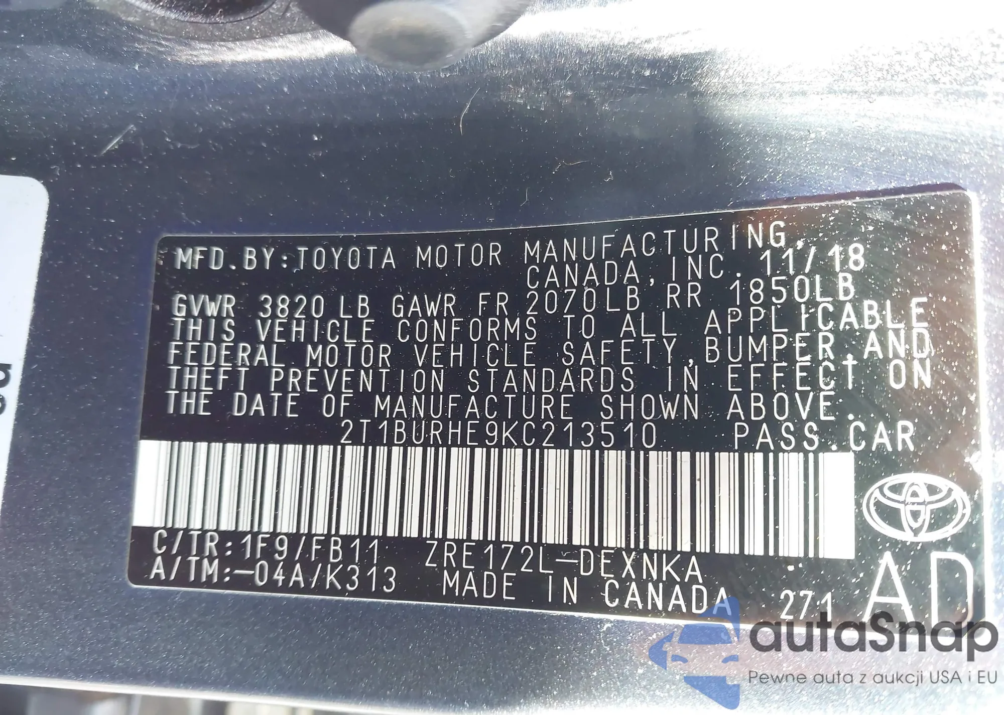 LOT: 43657279 VIN: 2T1BURHE9KC213510