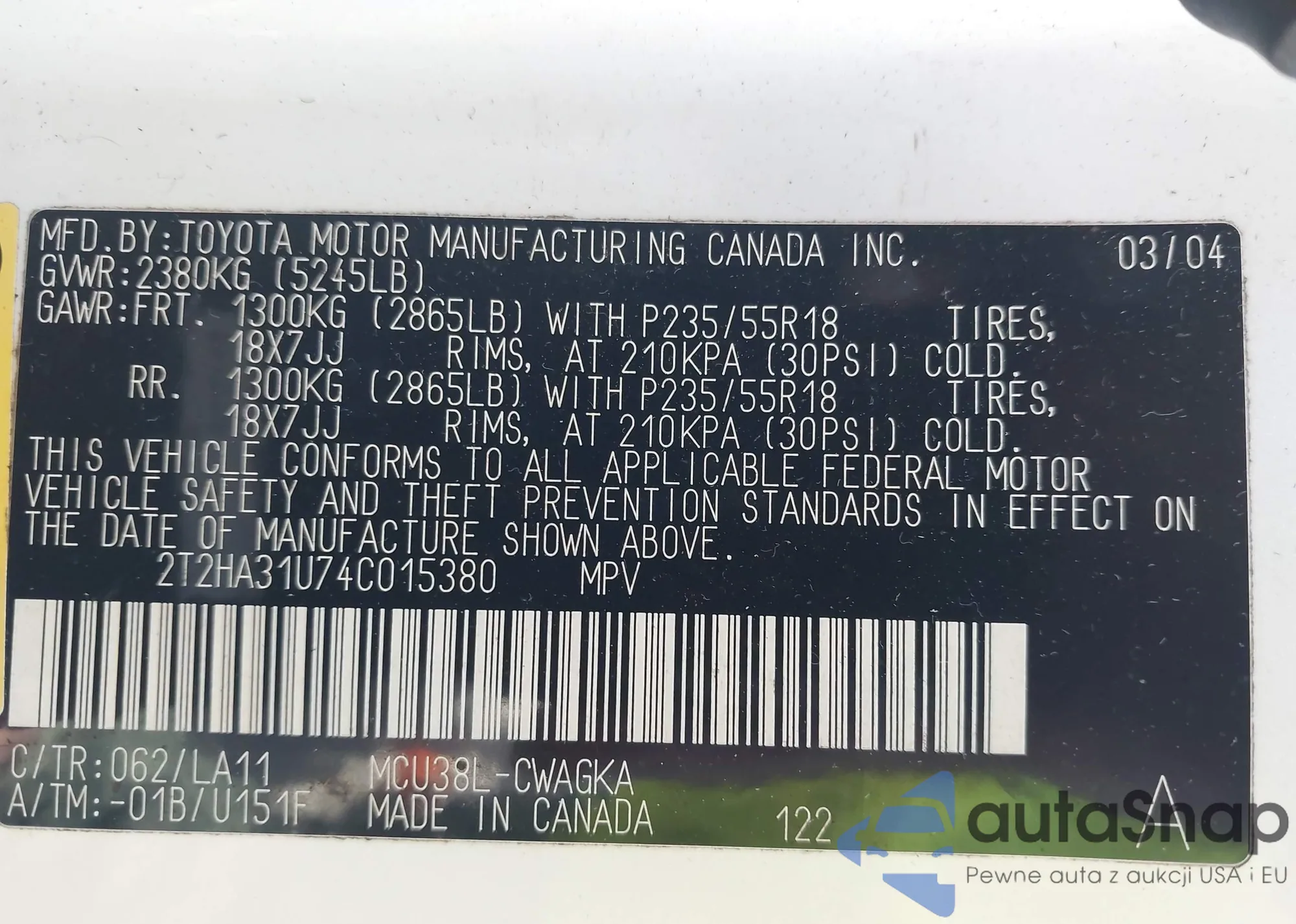 • VIN 2T2HA31U74C015380