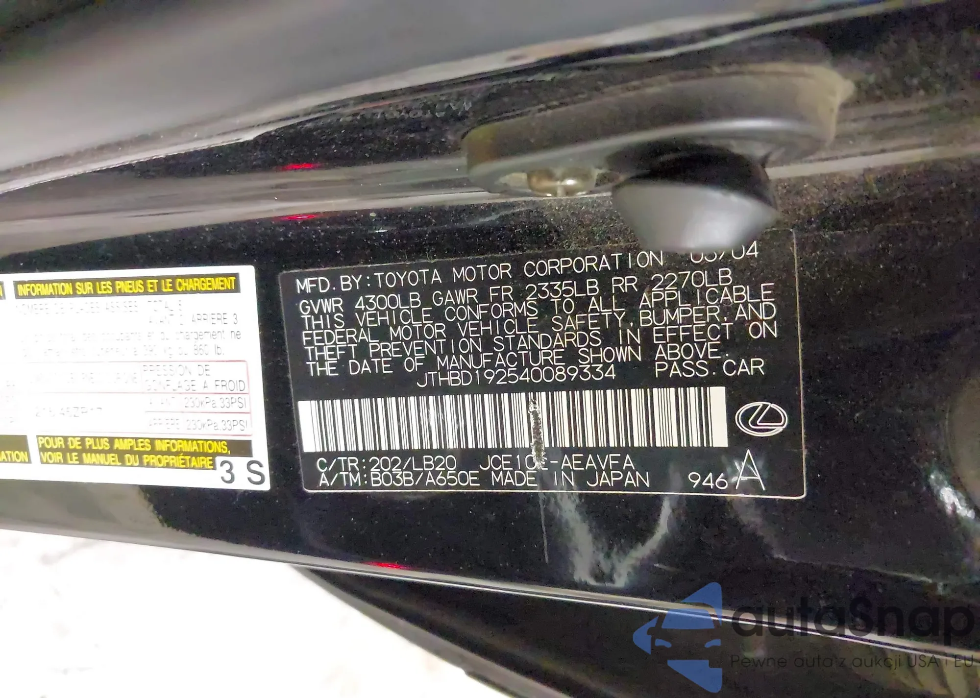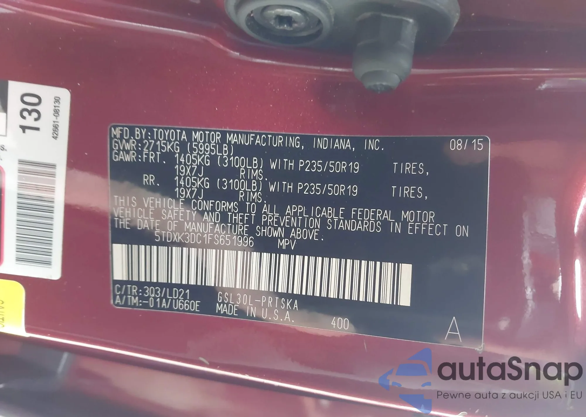 LOT: 42152220 VIN: JTMWFREV0FJ047999