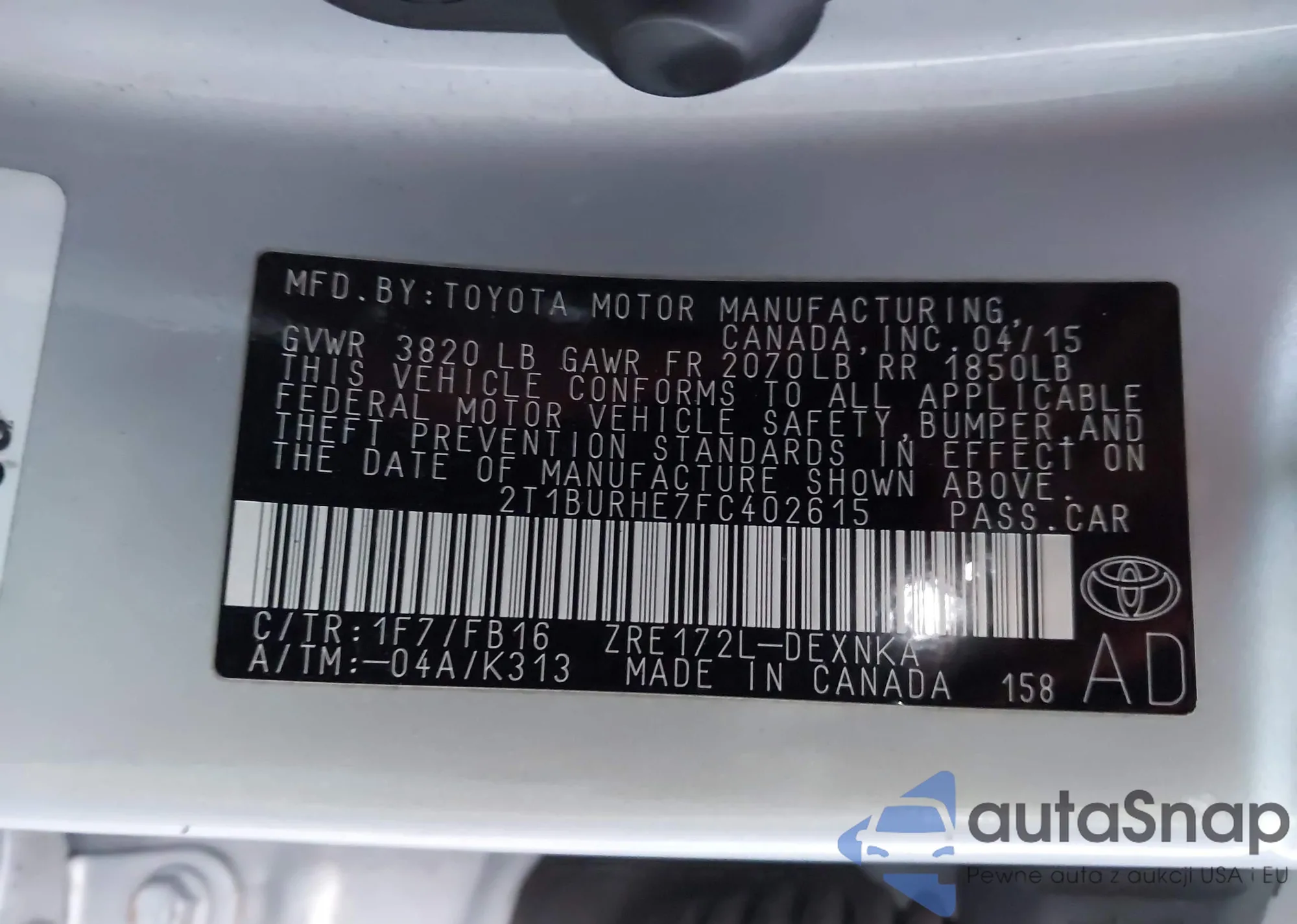 2015 Toyota Corolla Le z USA, uszkodzony, nr VIN 2T1BURHE7FC402615