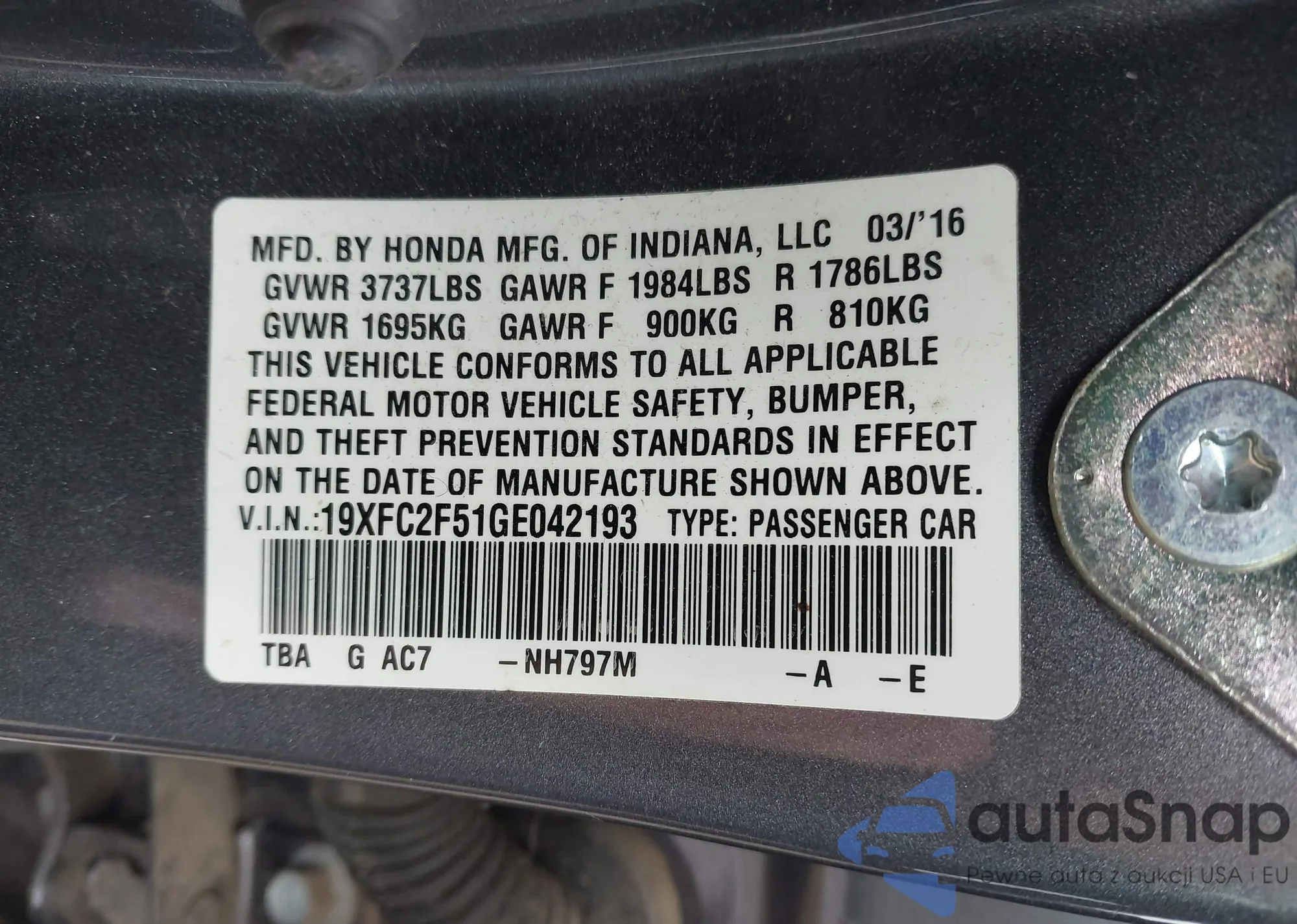 LOT: 43756102 VIN: 19XFC2F51GE042193