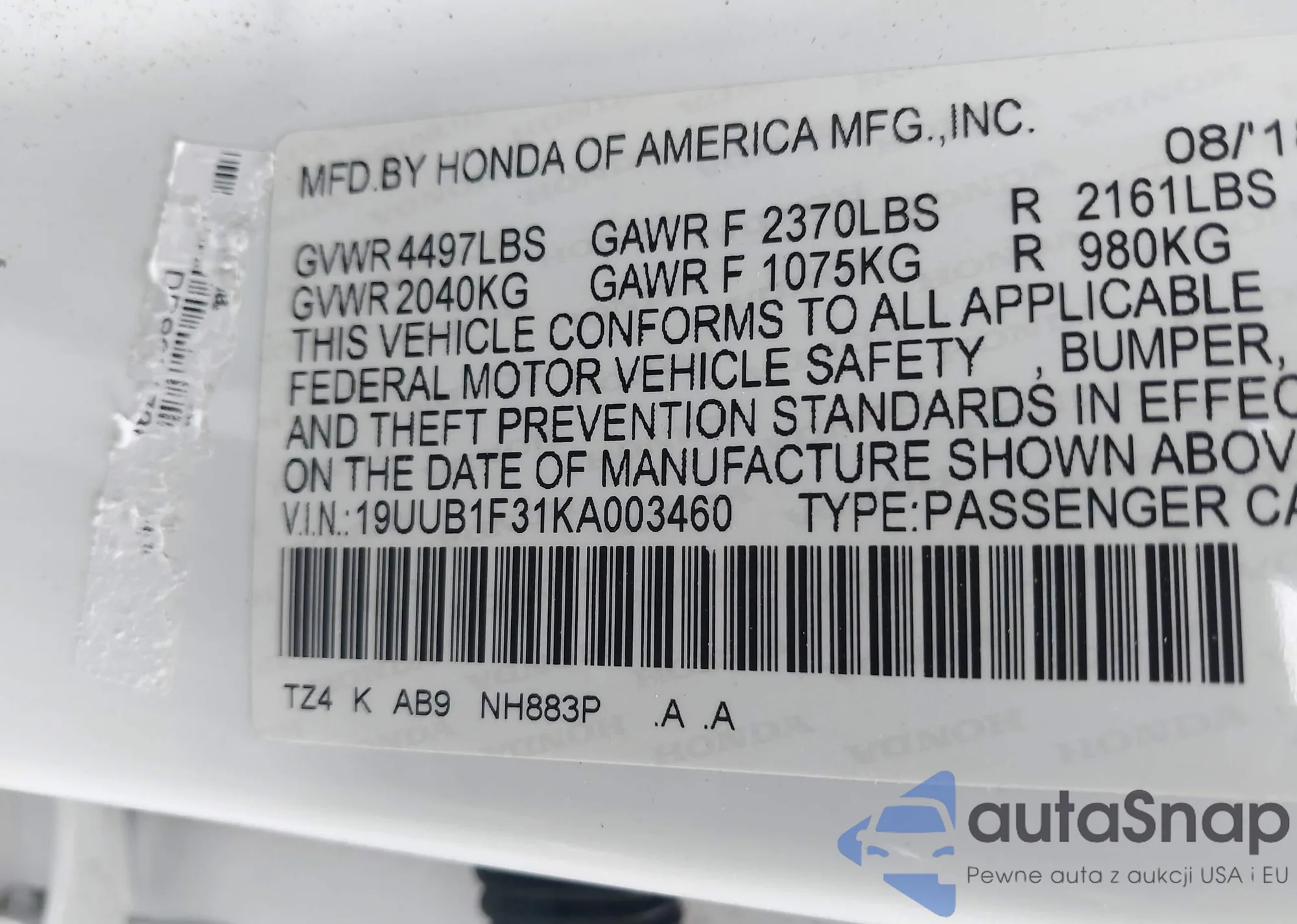 • VIN 19UUB1F31KA003460