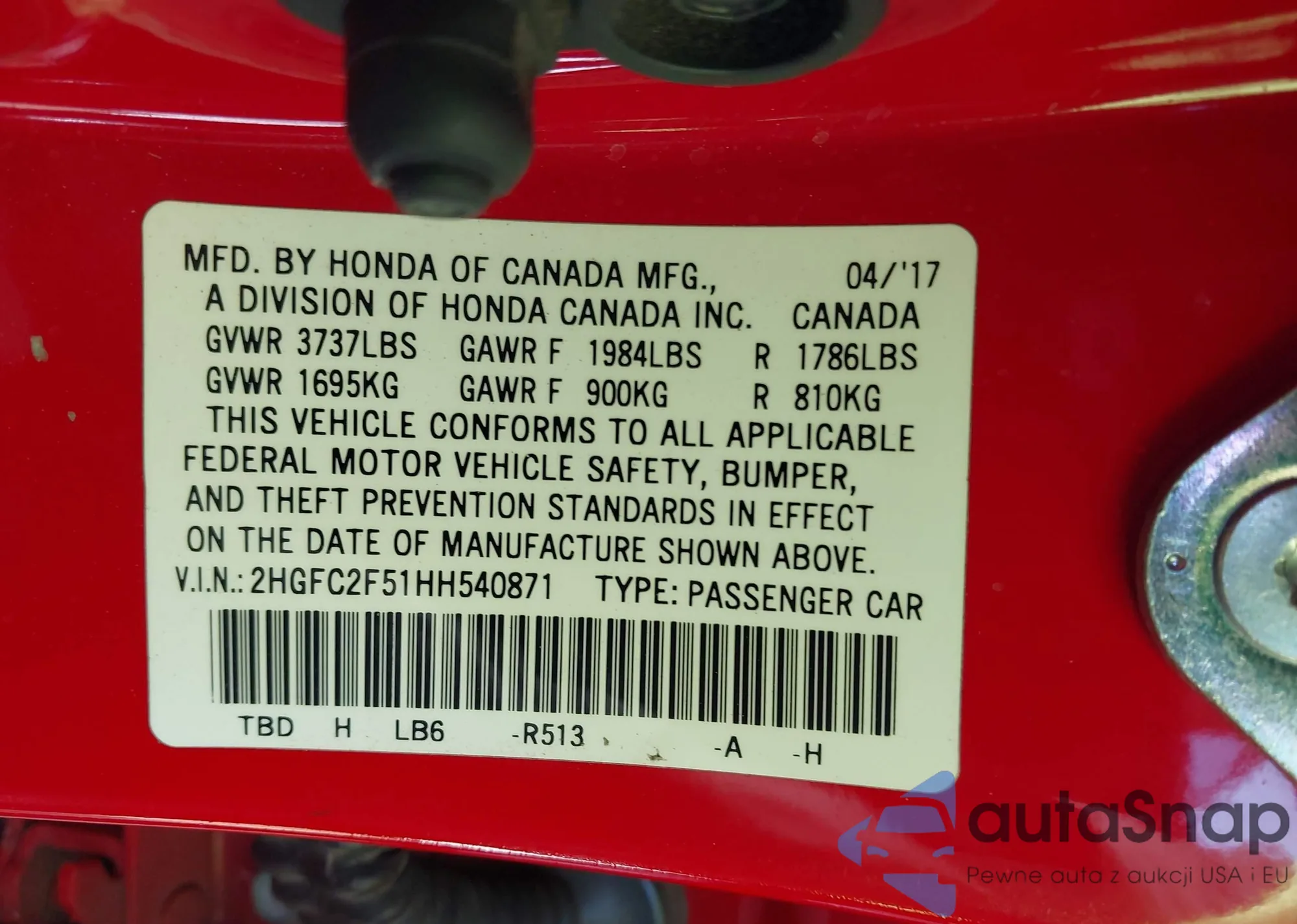 LOT: 43840510 VIN: 2HGFC2F51HH540871