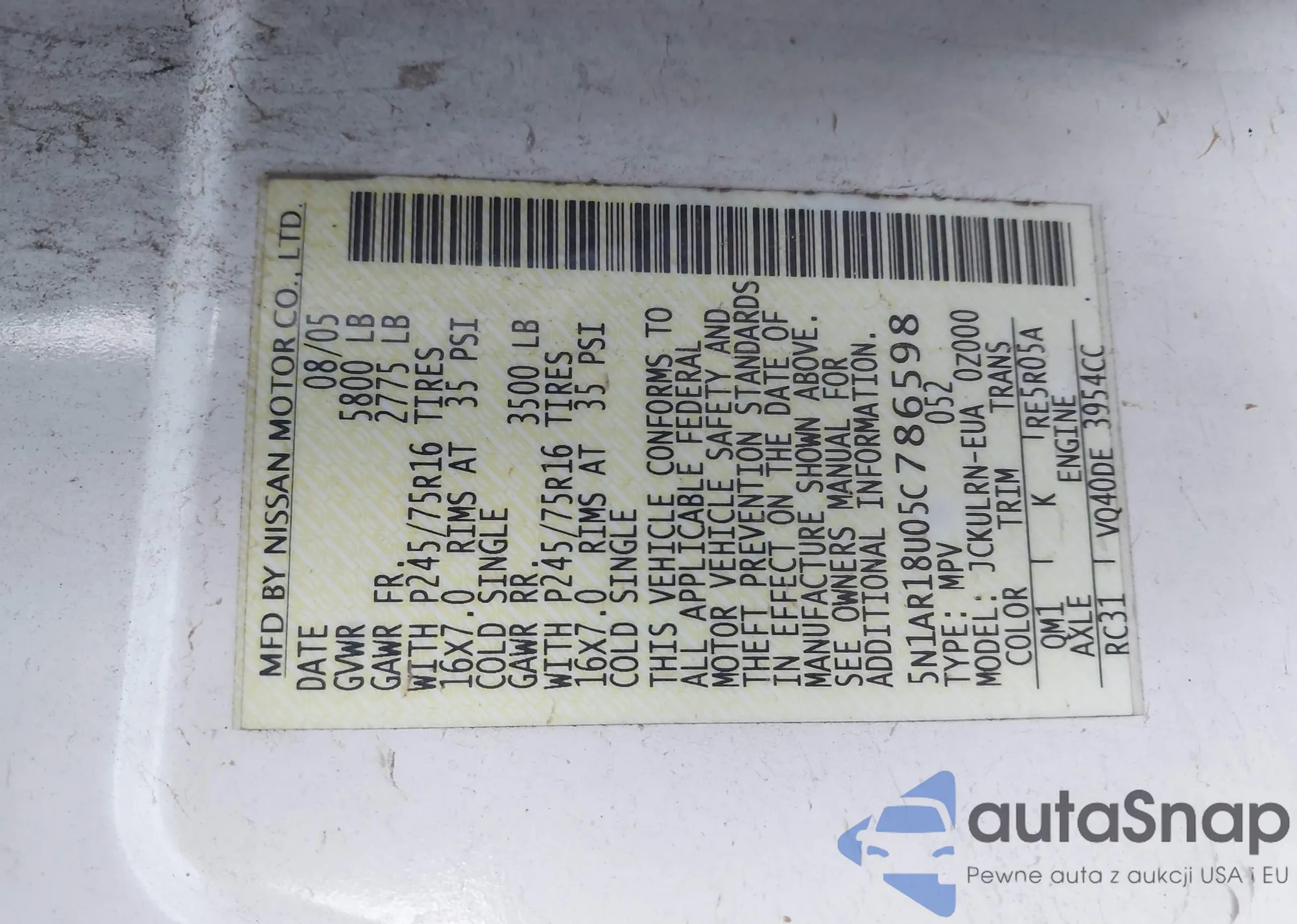 2005 Nissan Pathfinder Xe z USA, uszkodzony, nr VIN 5N1AR18U05C786598