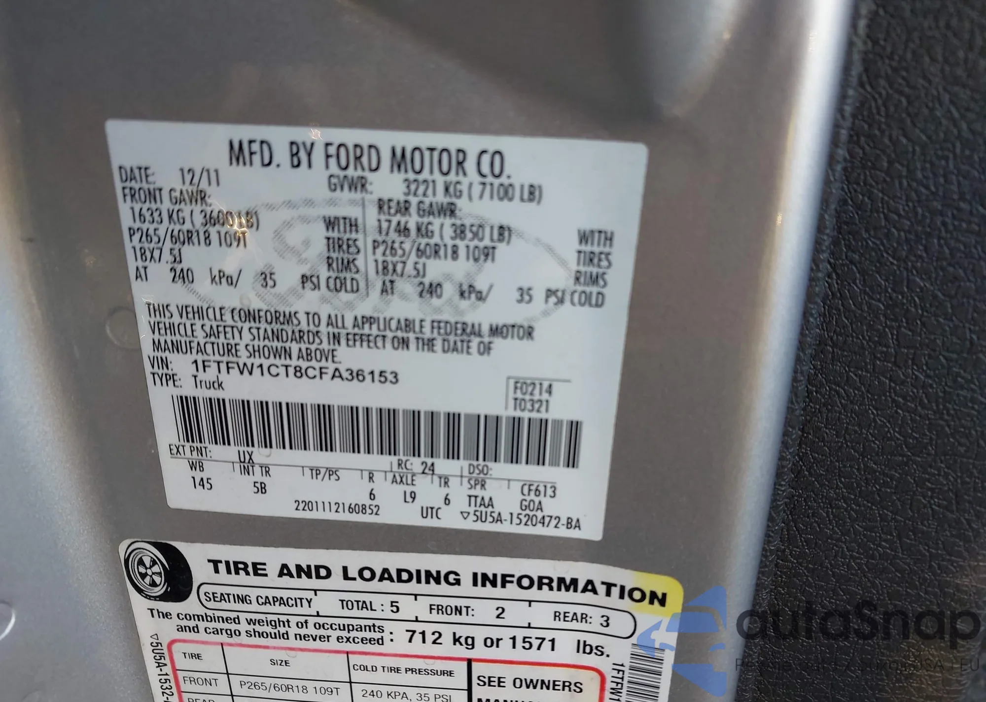 LOT: 43904178 VIN: 1FTFW1CT8CFA36153