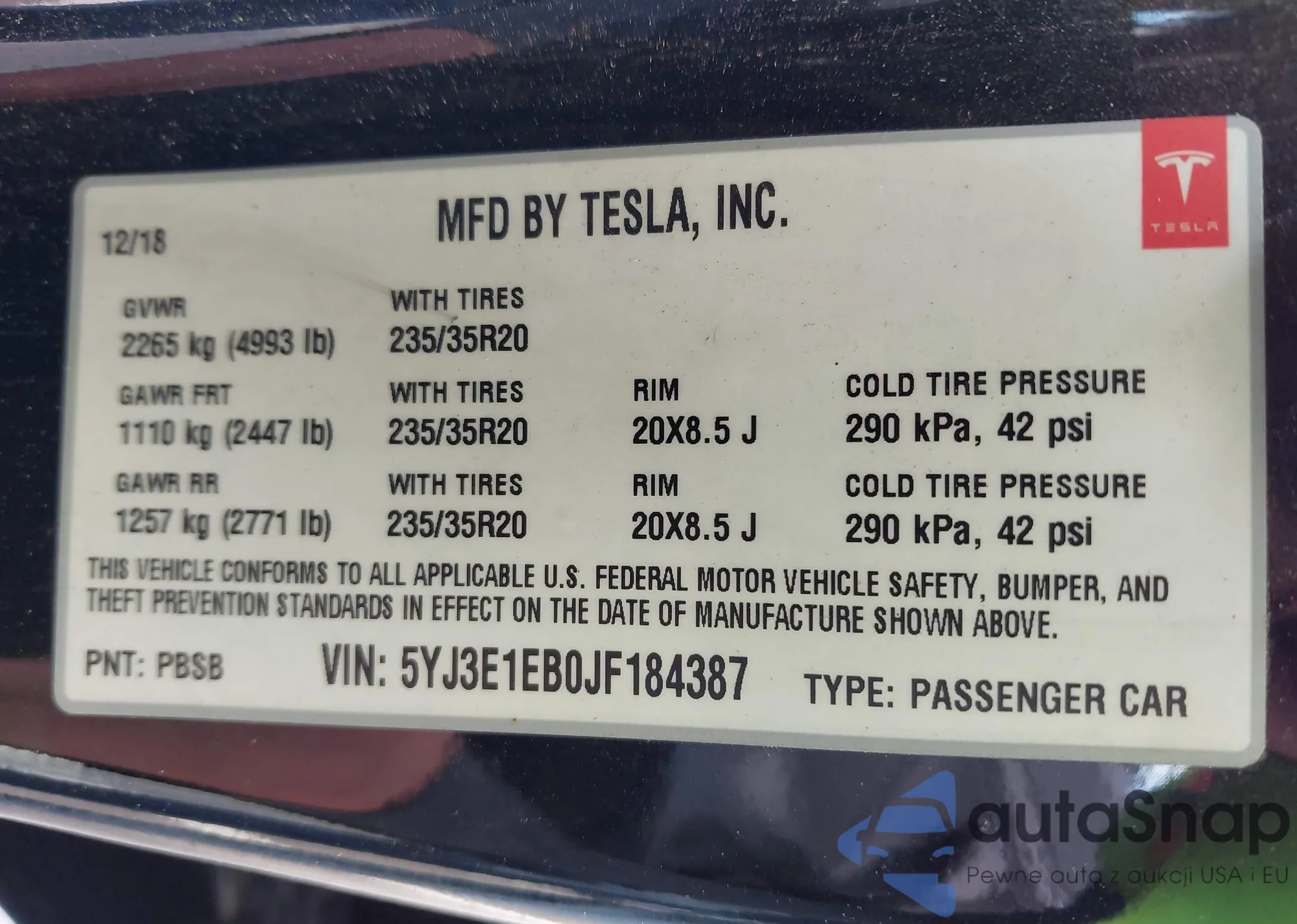 • VIN 5YJ3E1EB0JF184387