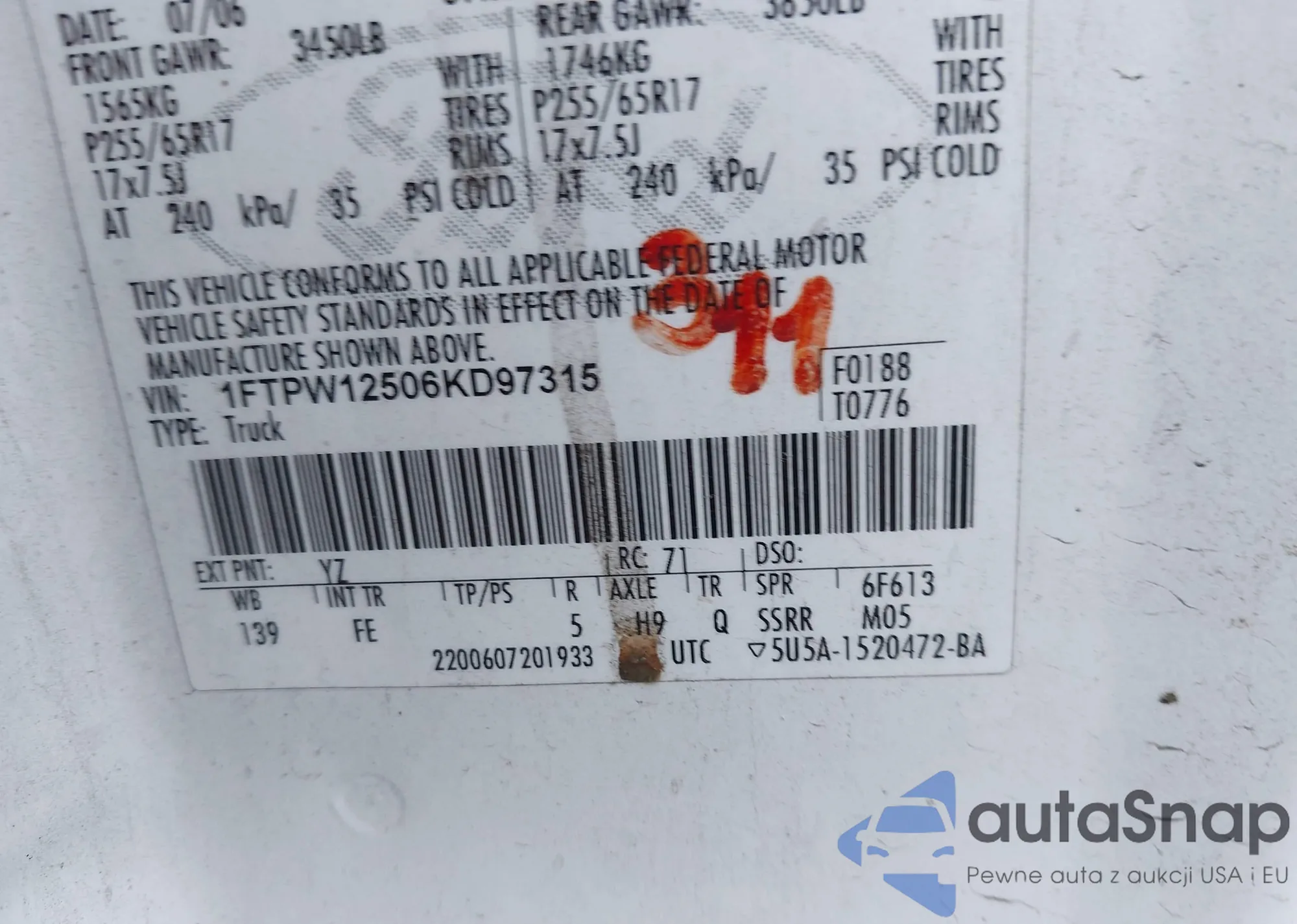 LOT: 43785585 VIN: 1FTPW12506KD97315