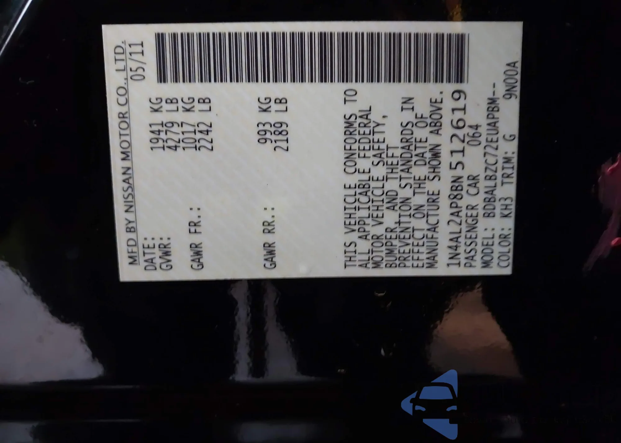 • VIN 1N4AL2AP8BN512619