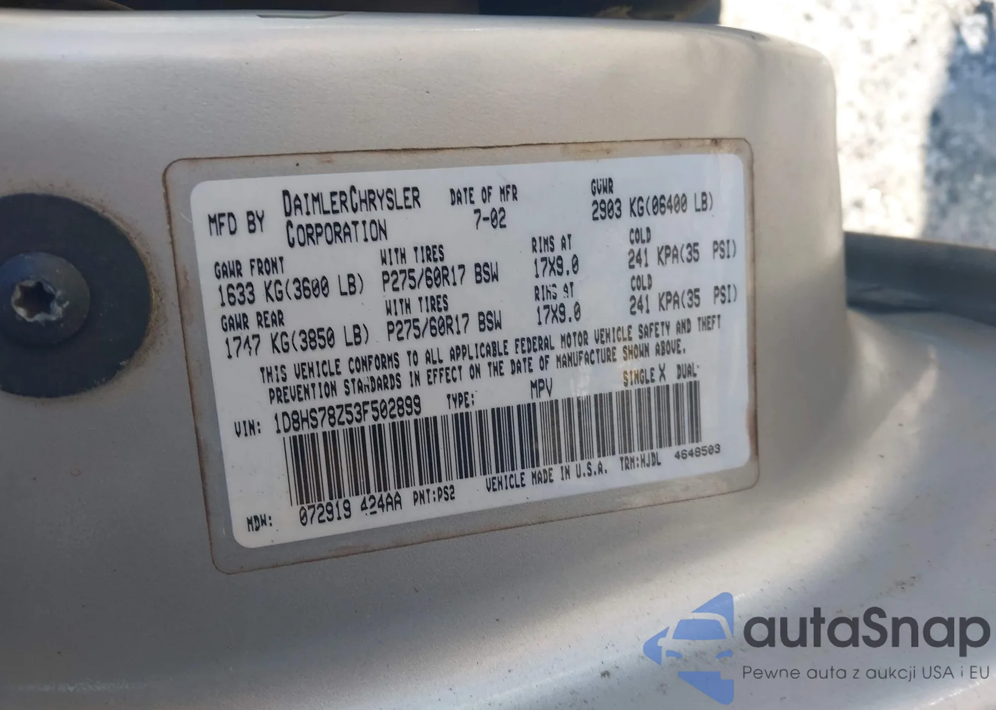 • VIN 1D8HS78Z53F502899