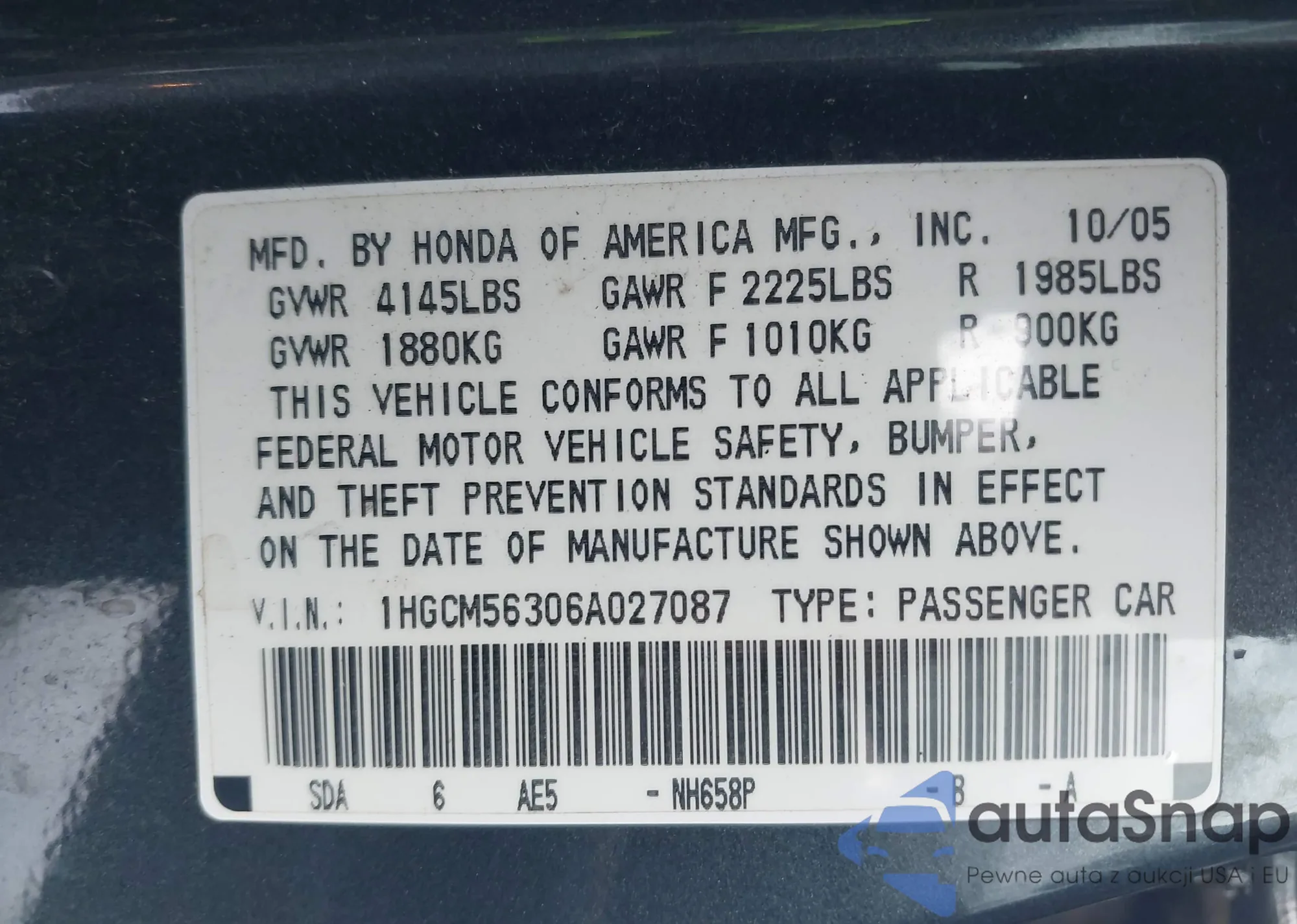 LOT: 43822692 VIN: 1HGCM56306A027087