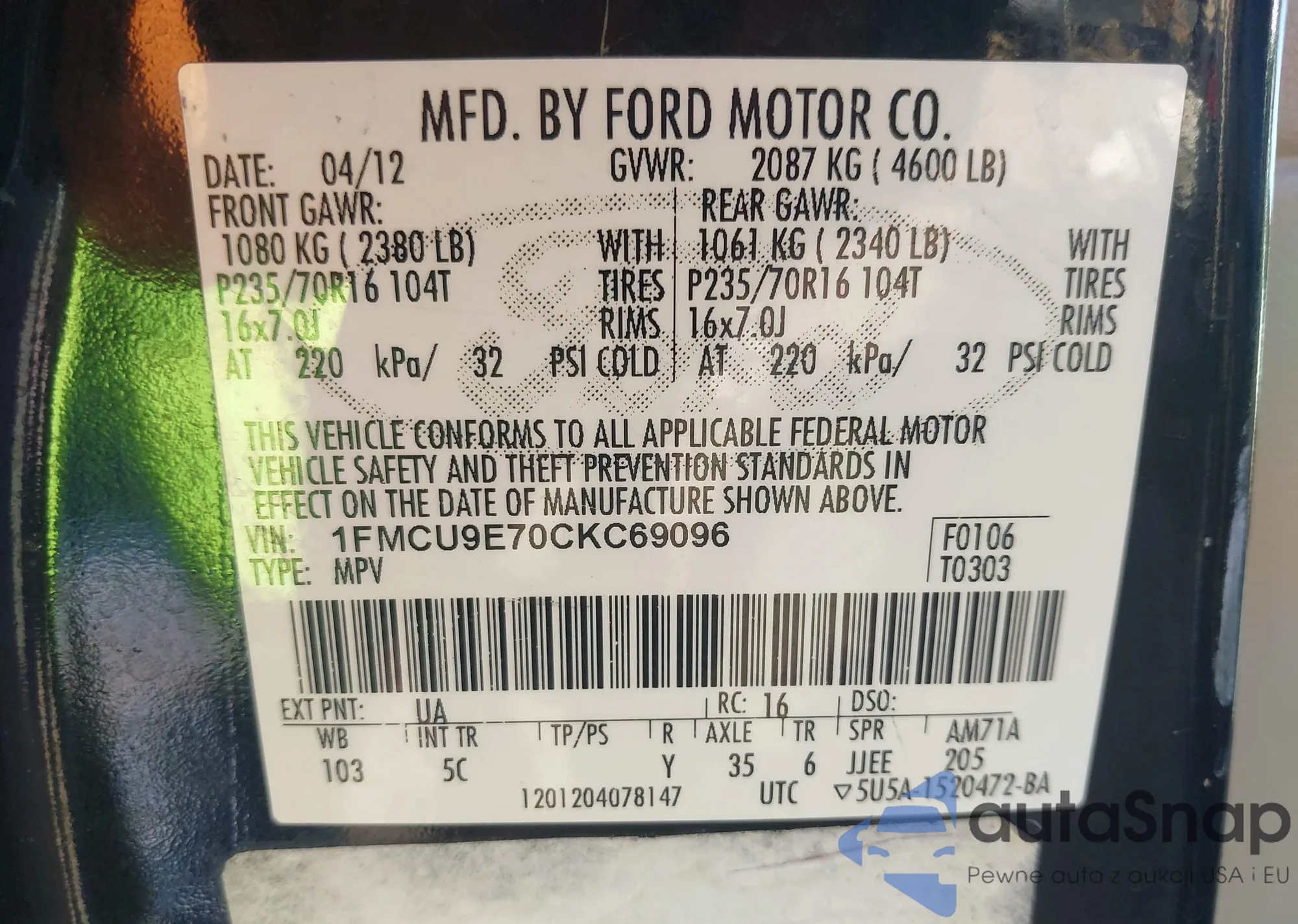• VIN 1FMCU9E70CKC69096