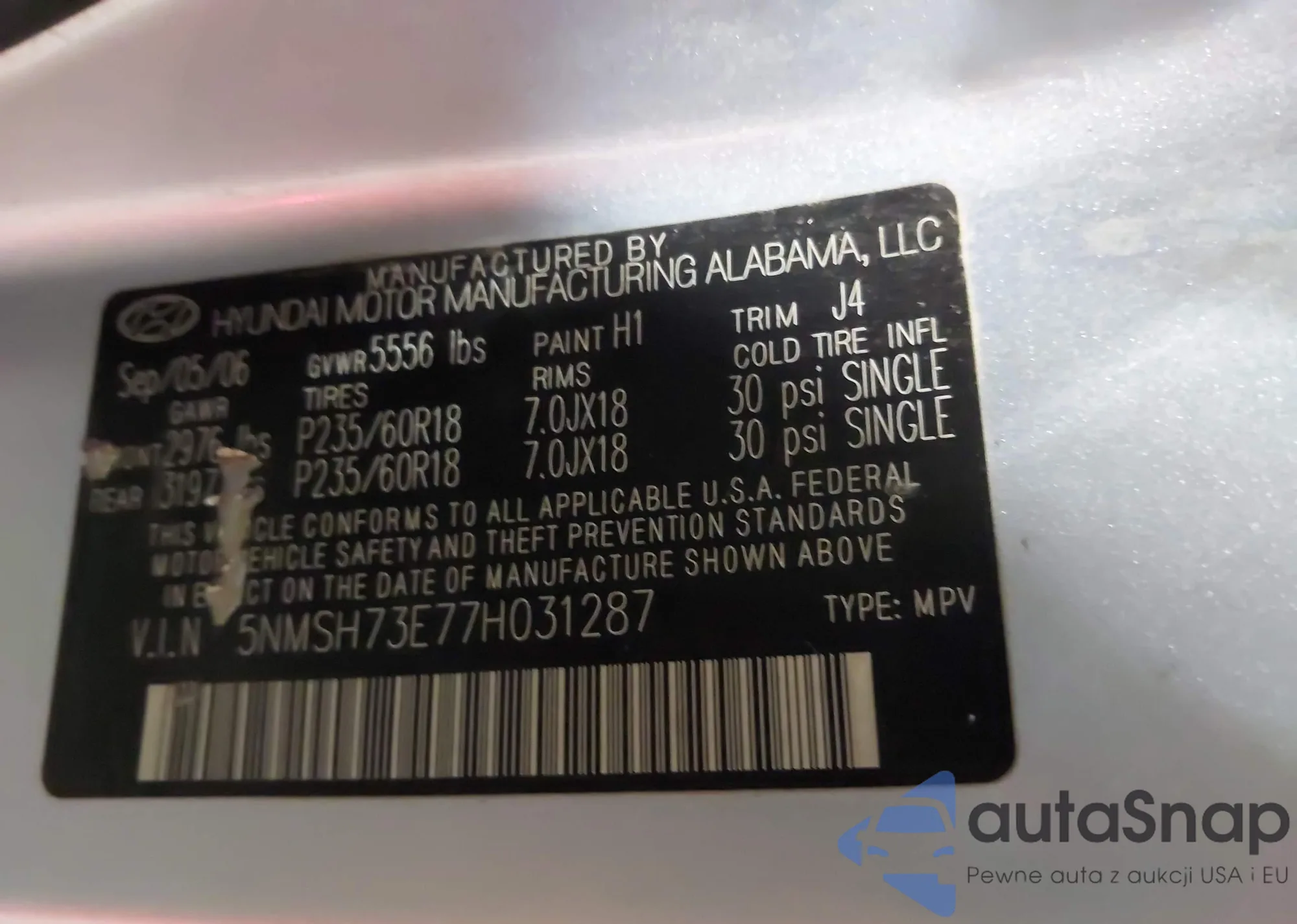 LOT: 43792007 VIN: 5NMSH73E77H031287