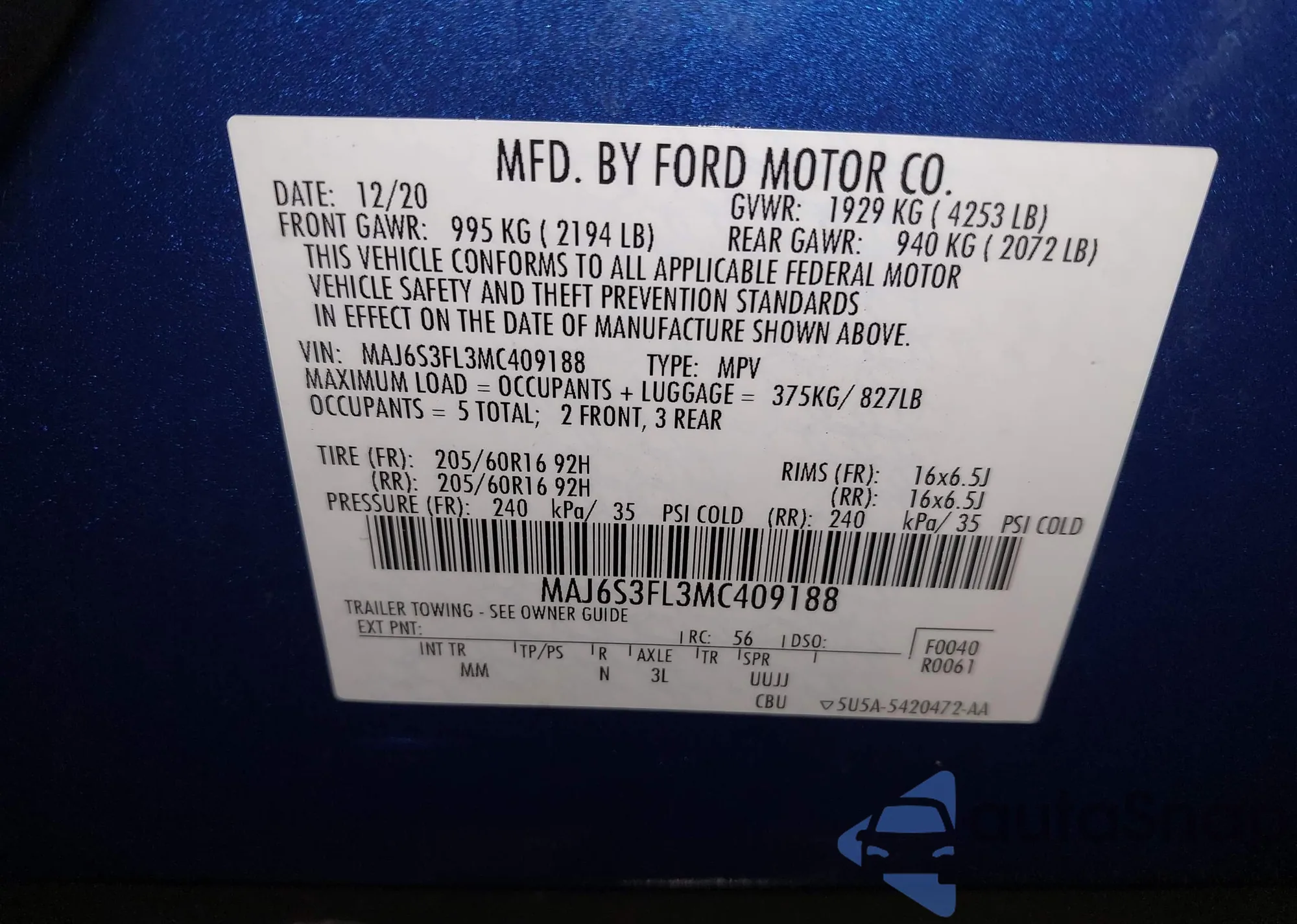 LOT: 43794449 VIN: MAJ6S3FL3MC409188