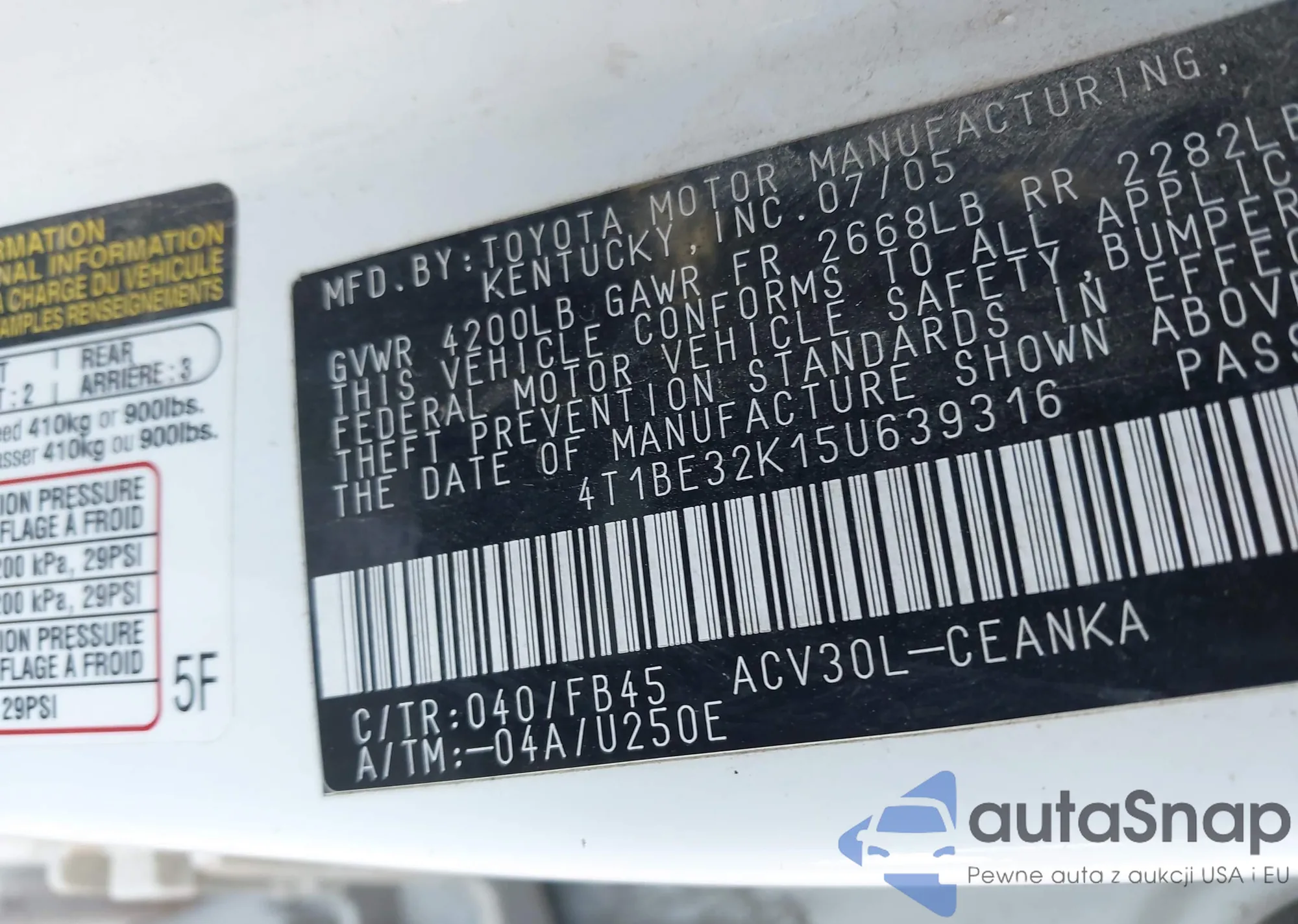 • VIN 4T1BE32K15U639316