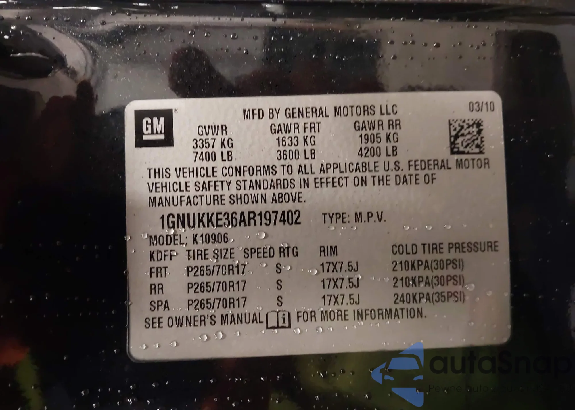 • VIN 1GNUKKE36AR197402