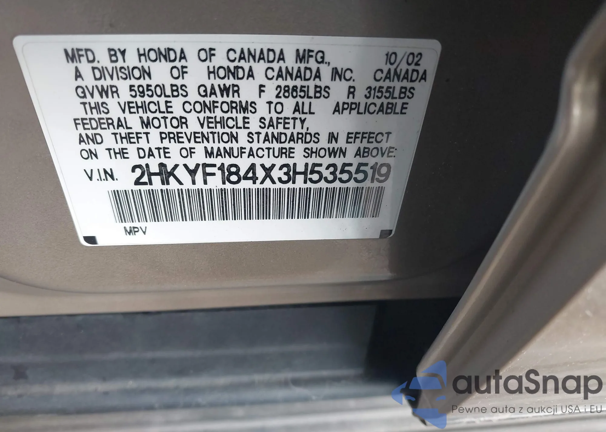 • VIN 2HKYF184X3H535519