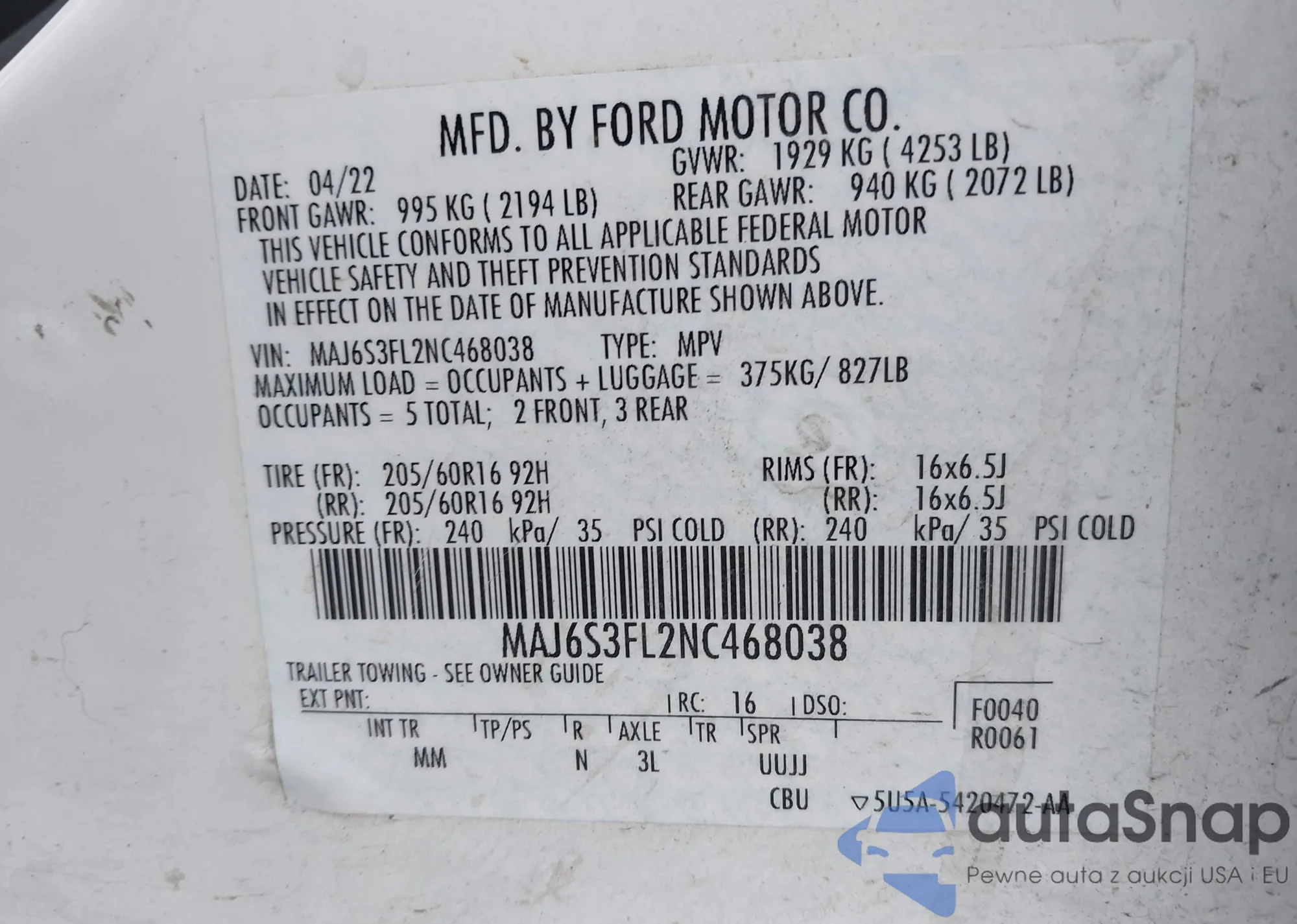 • VIN 1FMCU9D7XAKB18149