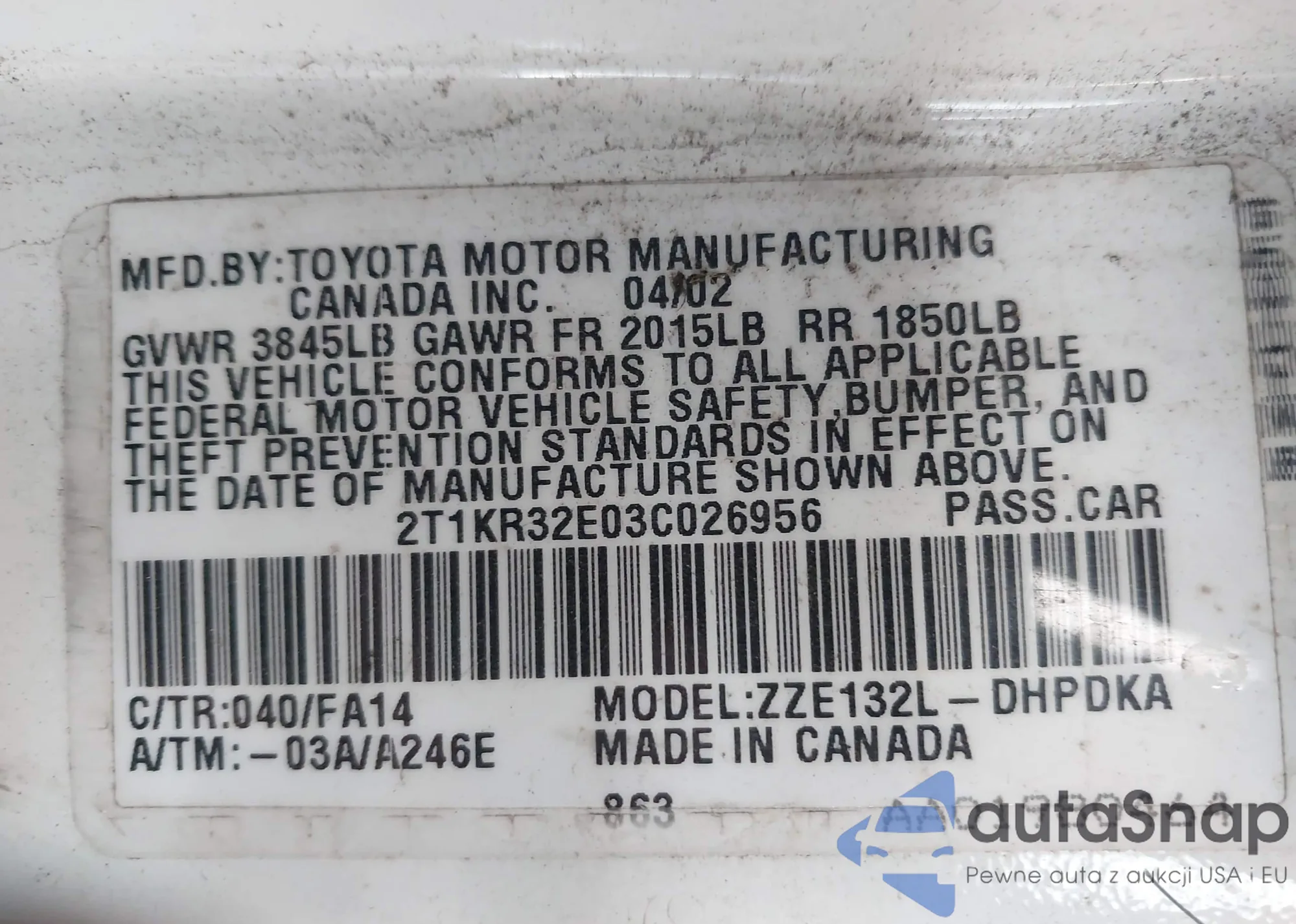 • VIN 2T1KR32E03C026956