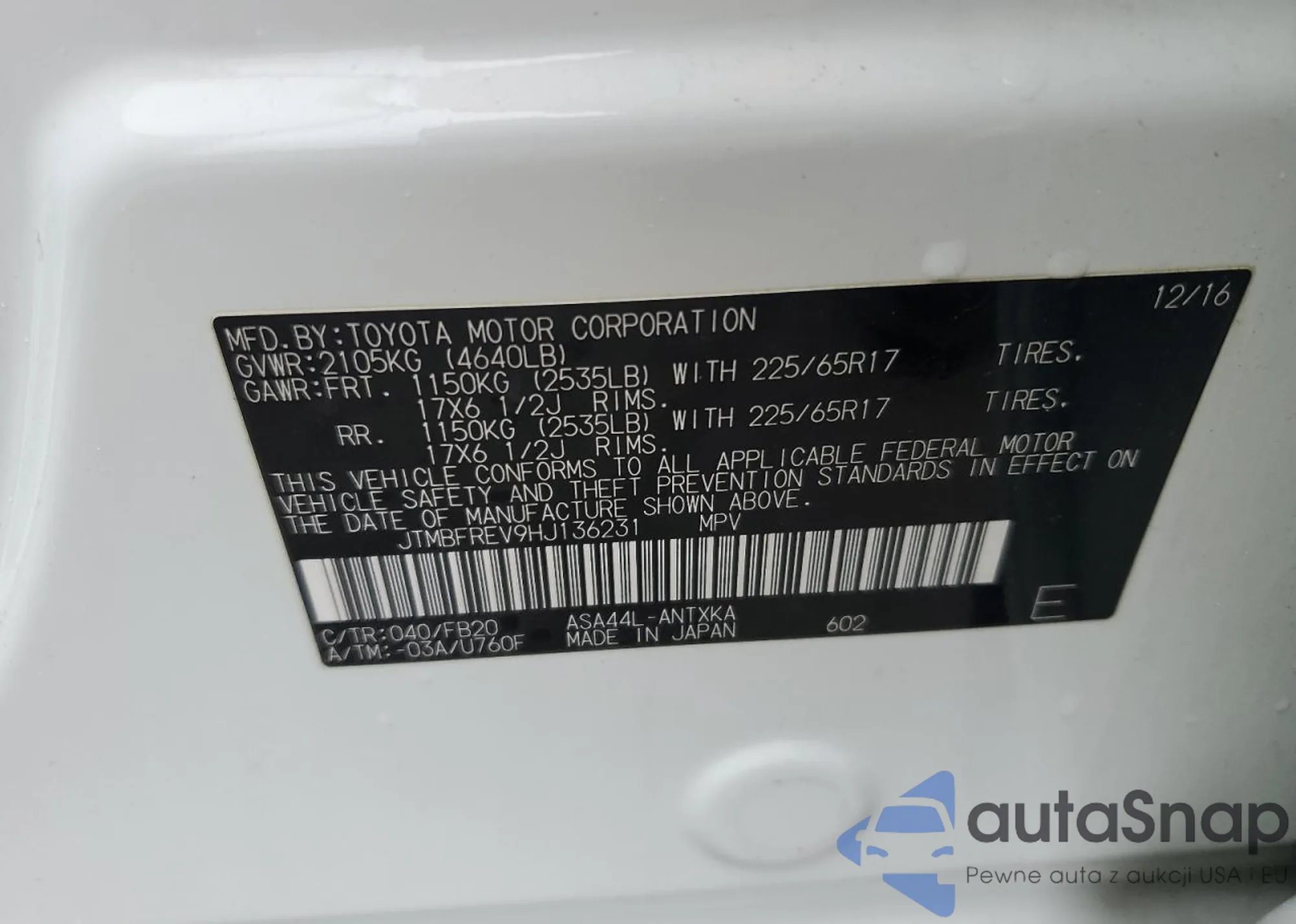 LOT: 66498545 VIN: JTMBFREV9HJ136231