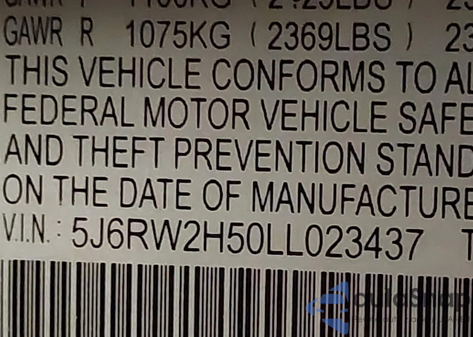 • VIN 5J6RW2H50LL023437