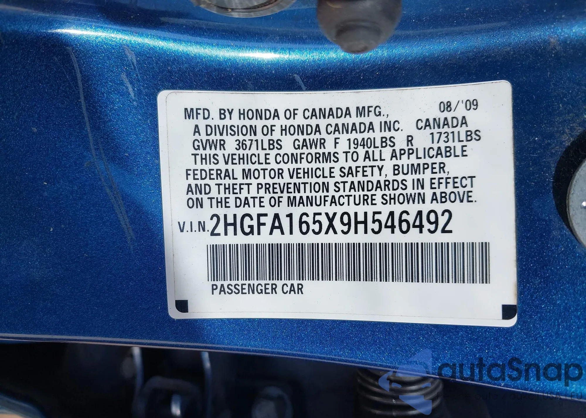 • VIN 2HGFC2F54HH568406