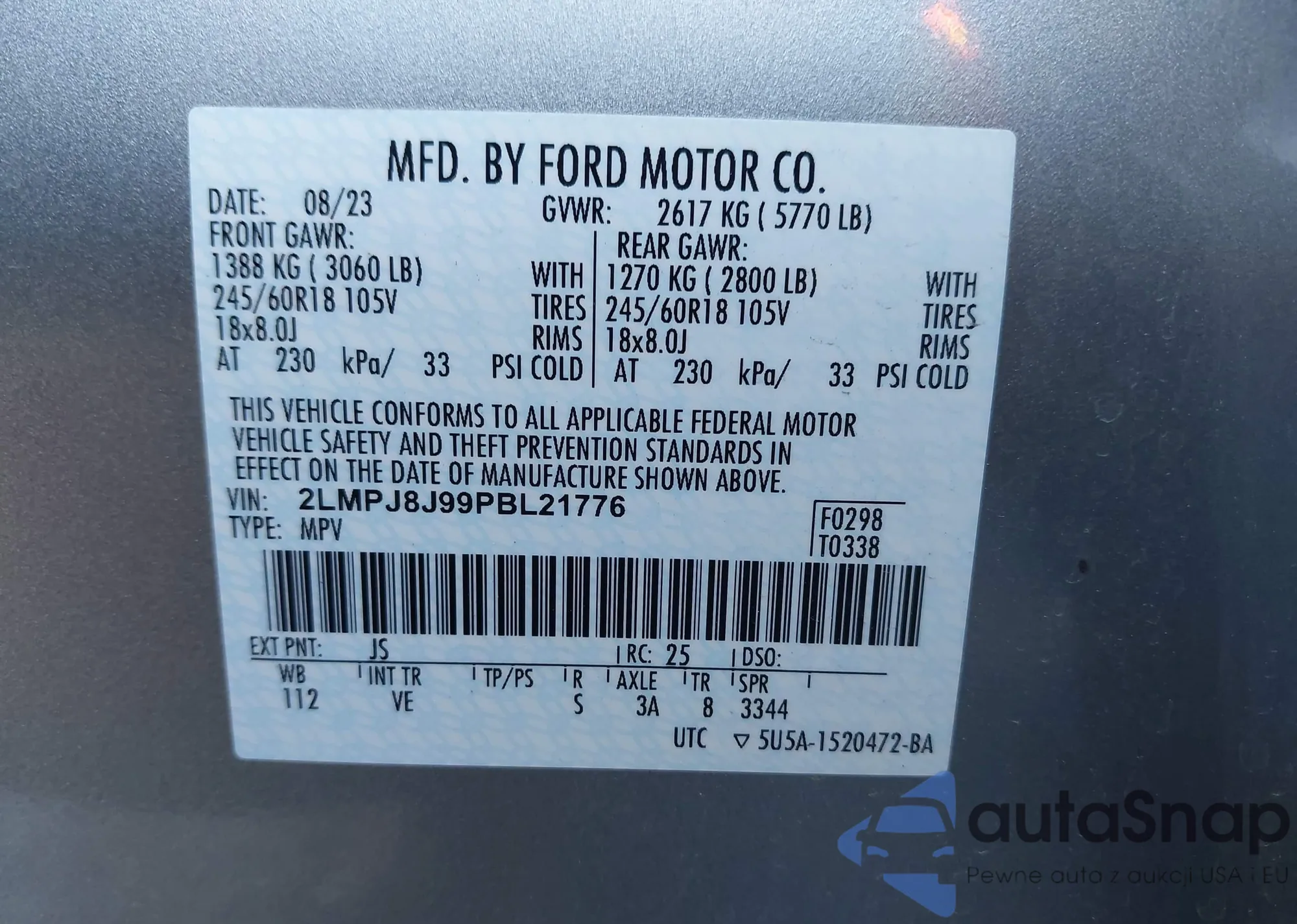 LOT: 43907680 VIN: 2LMPJ8J99PBL21776