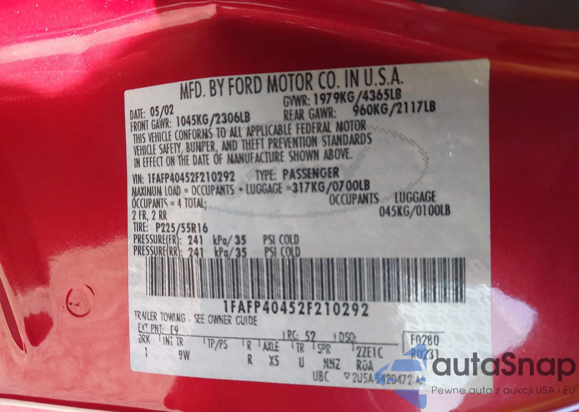 LOT: 43909388 VIN: 1FAFP40452F210292