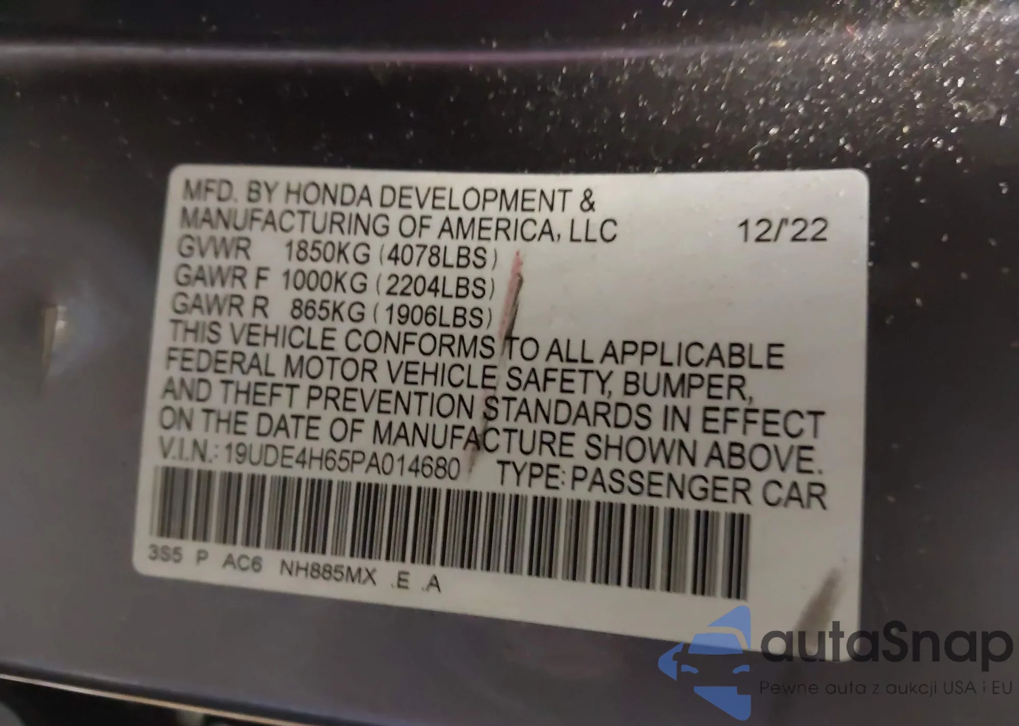 • VIN 19UDE4H65PA014680
