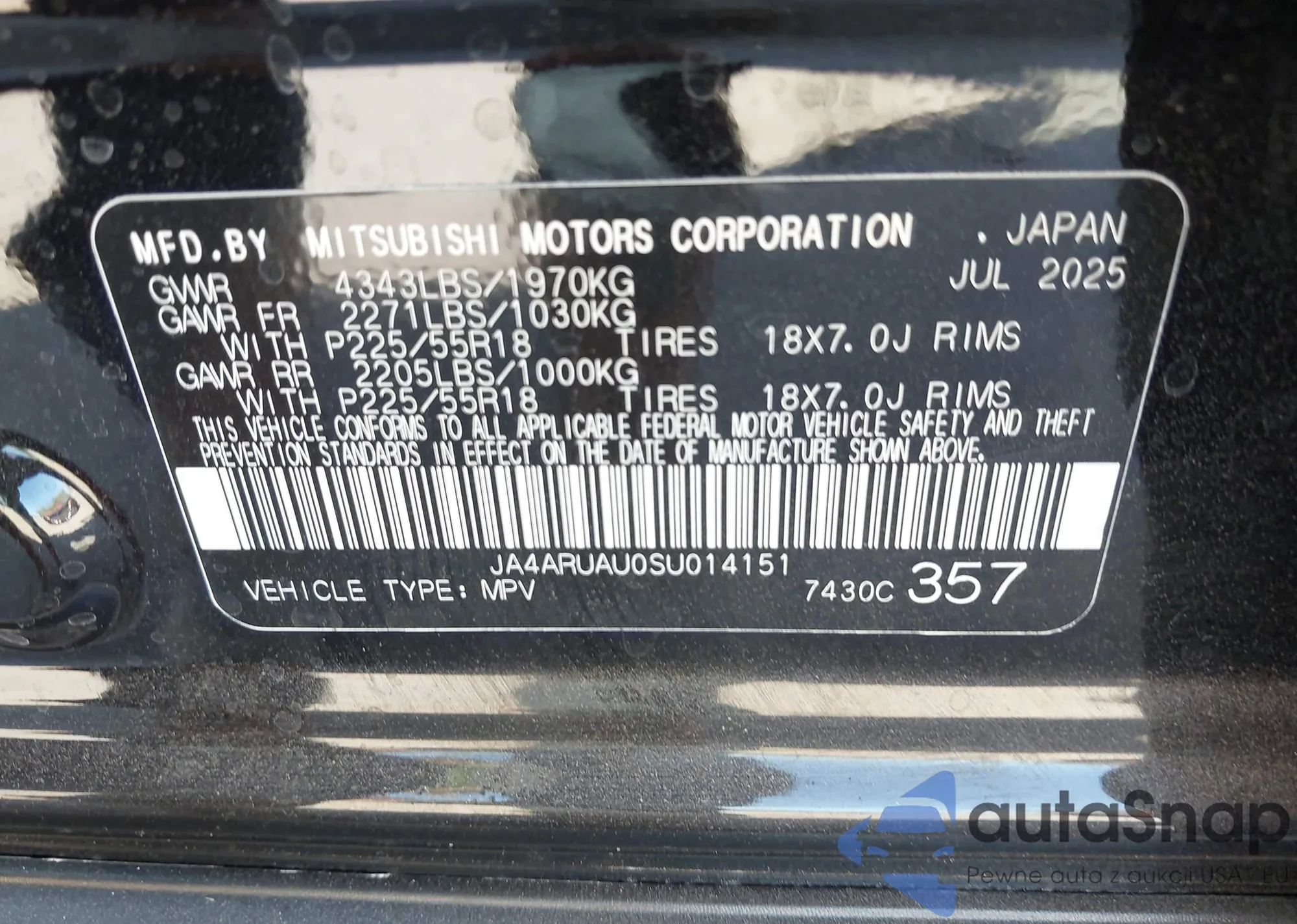 LOT: 43675574 VIN: JA4ARUAU0SU014151