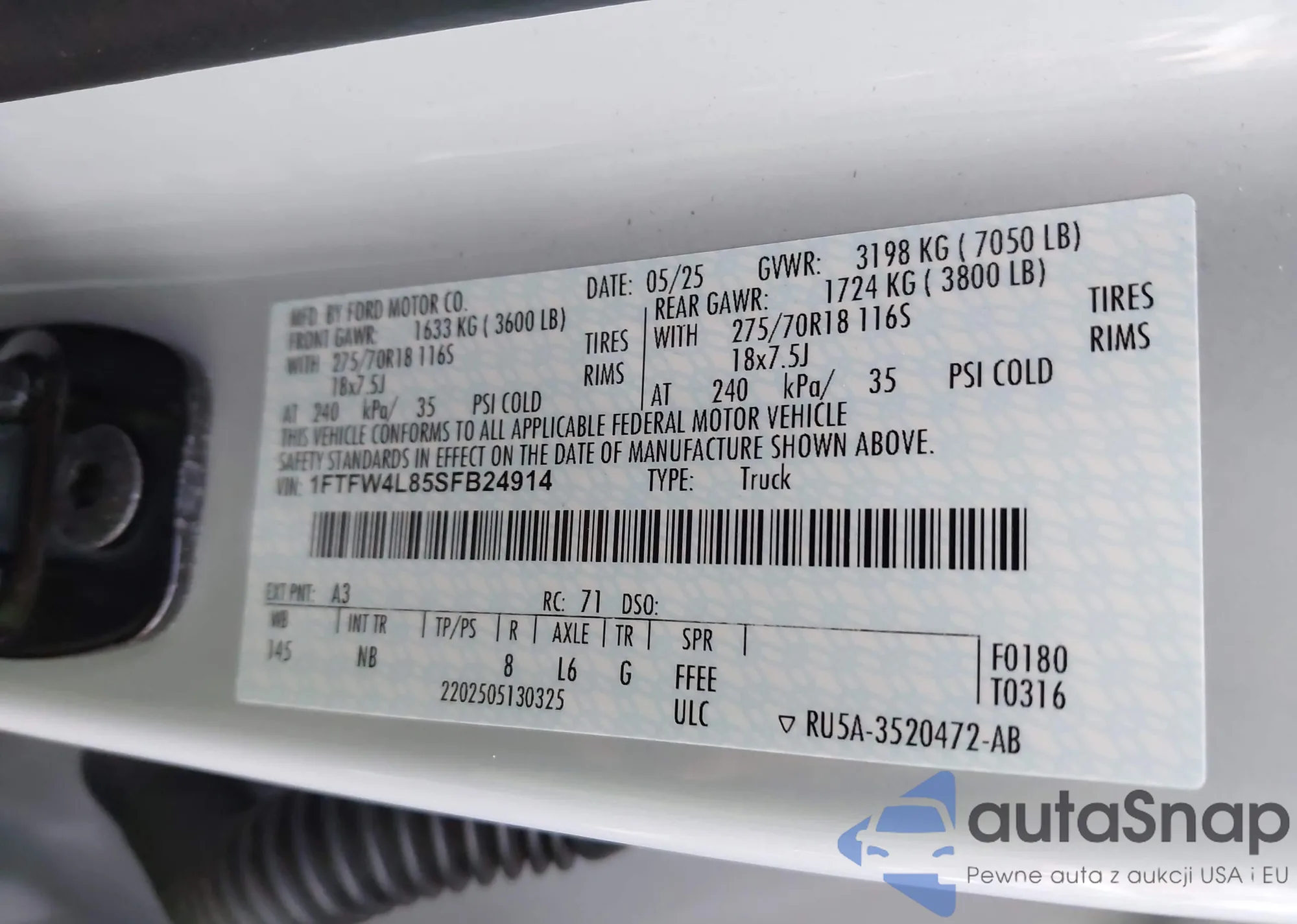 • VIN 1FTFW4L85SFB24914