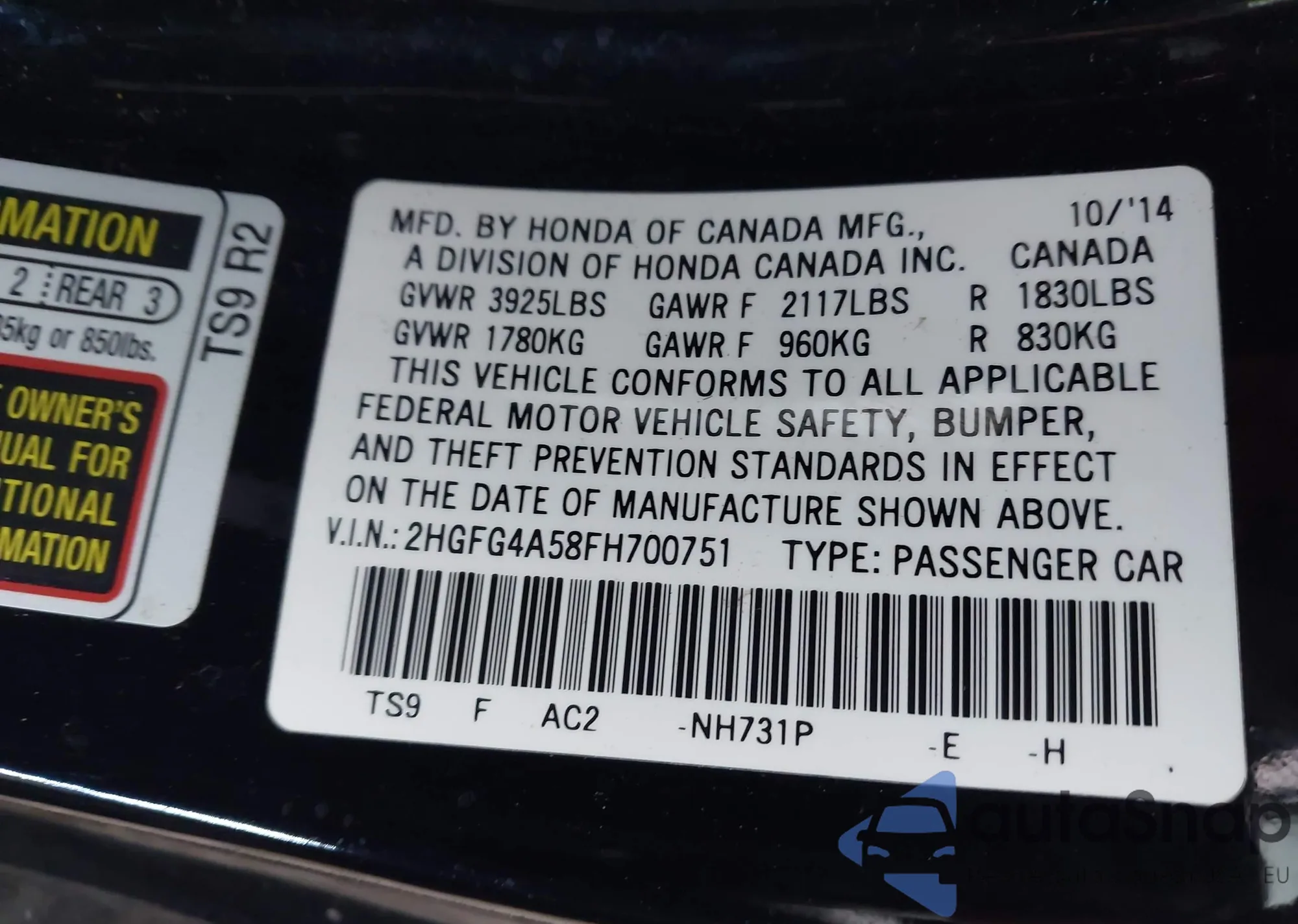 • VIN 2HGFG4A58FH700751