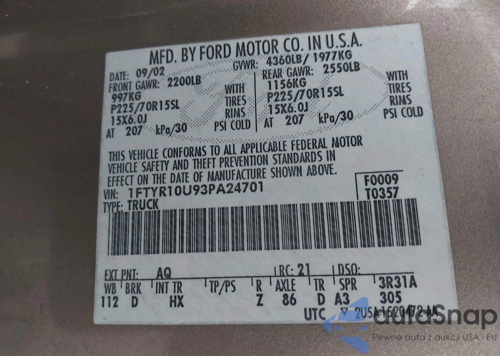 LOT: 43685103 VIN: 1FTYR10U93PA24701